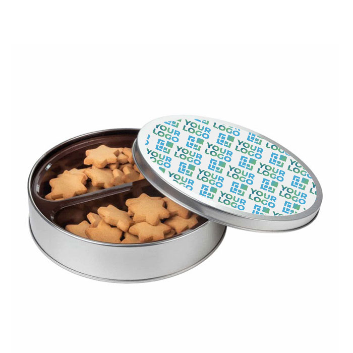 Una caja metálica con estrellitas de jengibre, mantequilla y miel, personalizada con tu marca, ofrece un dulce con un sabor distintivo y una presentación cuidada. Con 150 gramos de delicias, es un detalle que puedes entregar en la época navideña, en eventos especiales o como obsequio a clientes selectos. Este dulce gourmet, sin leche y fabricado con PET reciclado, eleva la percepción de tu empresa, asociándola con la calidad y la originalidad. Fomenta un recuerdo duradero y diferenciador, dejando una impresión de sofisticación.