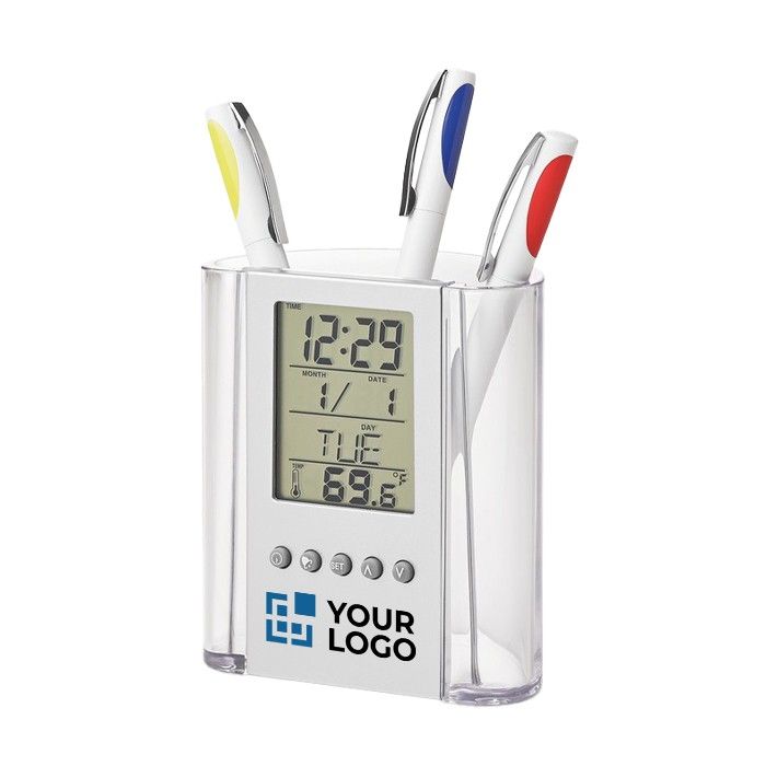 Un práctico y completo lapicero que destaca por su utilidad y estilo. Fabricado en acrílico , su diseño moderno y resistente incluye una pantalla y cinco botones de manejo, lo que le ermite ofrecer 4 funcionalidades en un solo producto: almacenar lápices, calendario, reloj y termómetro. Al poderse personalizar con tu logo mediante UV Digital o tampografía asegura una presencia constante de tu marca en cualquier escritorio u oficina. Incluye una pila botón para un funcionamiento inmediato. En otras plabras, este bestseller es una opción ingeniosa y muy útil para fortalecer relaciones empresariales y equipar tus oficinas con material corporativo. Dispone de servicio Express.
