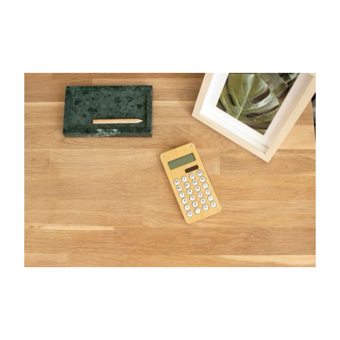 Calculadora de bambú y plástico con panel solar, pensada para el día a día en mostradores y puestos de trabajo. Muestra hasta 8 dígitos para cálculos rápidos y mantiene una lectura clara. Incorpora un pequeño juego de laberinto de bolas en la parte trasera, útil como detalle diferenciador en acciones de comunicación. Incluye pila para disponer de apoyo cuando no hay luz suficiente. Se entrega en bolsa y caja de presentación, adecuada para entregas en ferias, formaciones o bienvenida de oficina.