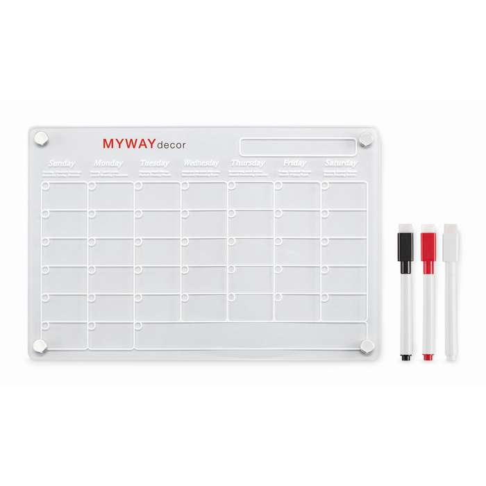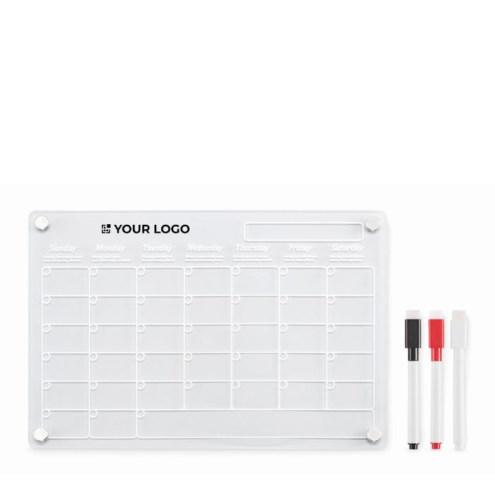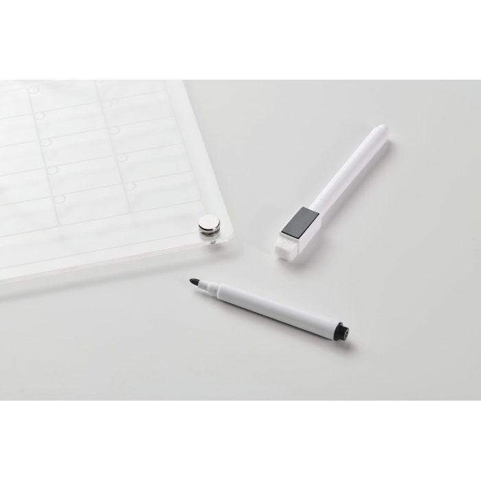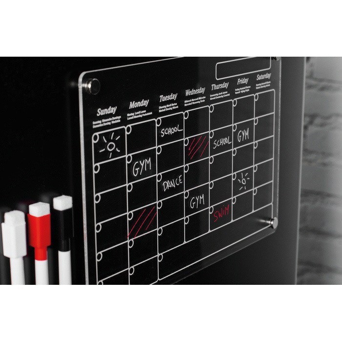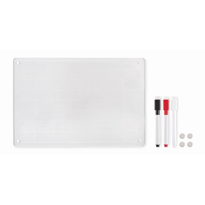 Agenda planificadora mensual de acrílico magnético en formato A4, pensada para organizar tareas y fechas en una superficie visible. La pizarra permite escribir y borrar fácilmente gracias a los 3 rotuladores magnéticos borrables incluidos en negro, rojo y blanco. Se instala de forma estable con los tornillos de montaje incluidos, ideal para salas de reuniones, recepción o zonas de trabajo compartidas. Opción práctica para planificación interna, seguimiento de proyectos o comunicación de turnos.