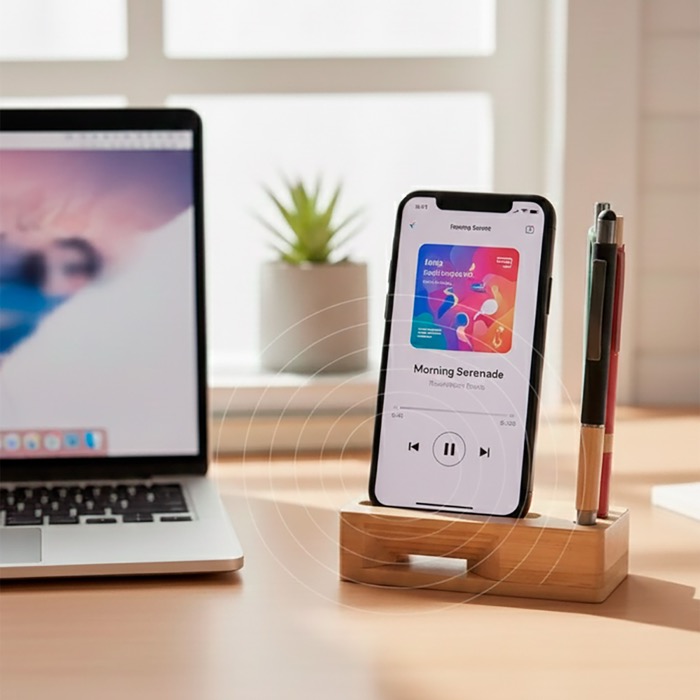 Soporte multifuncional de bambú natural con Certificación de Sostenibilidad Forestal, pensado para mantener el escritorio ordenado sin complicaciones. Permite colocar el móvil de forma estable, dejando la pantalla a la vista para videollamadas o notificaciones. Incluye espacio para organizar bolígrafos y pequeños accesorios, y cuenta con canal amplificador que mejora el sonido del dispositivo de manera natural, sin cables ni energía. El diseño es minimalista y discreto, fácil de integrar en oficina o estudio. Útil para acciones de bienvenida, eventos internos o merchandising corporativo.