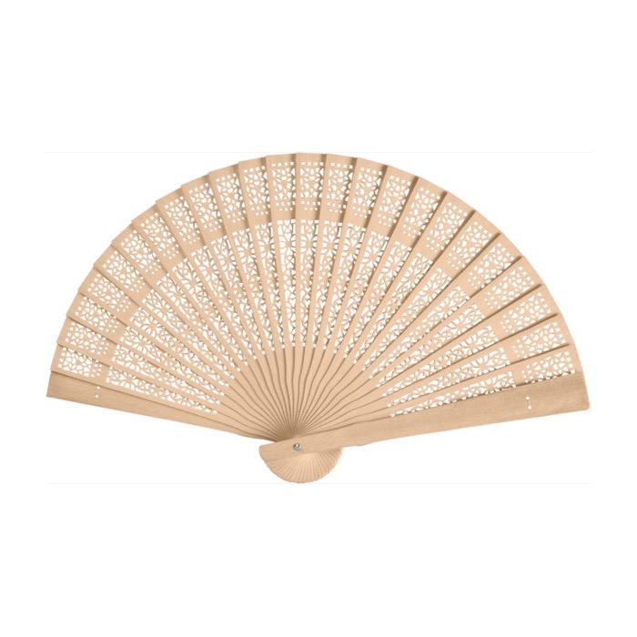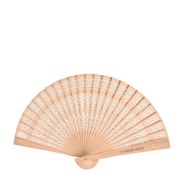 Abanico de madera con diseños ornamentales y posibilidad de marcaje en láser.