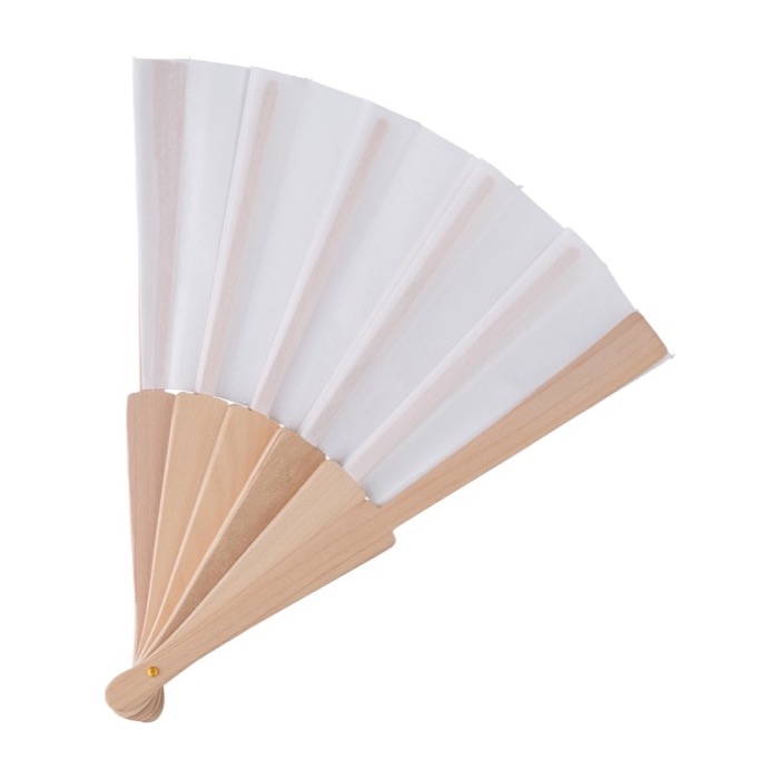 Abanico hecho de RPET color blanco con mango de madera clara