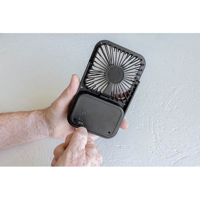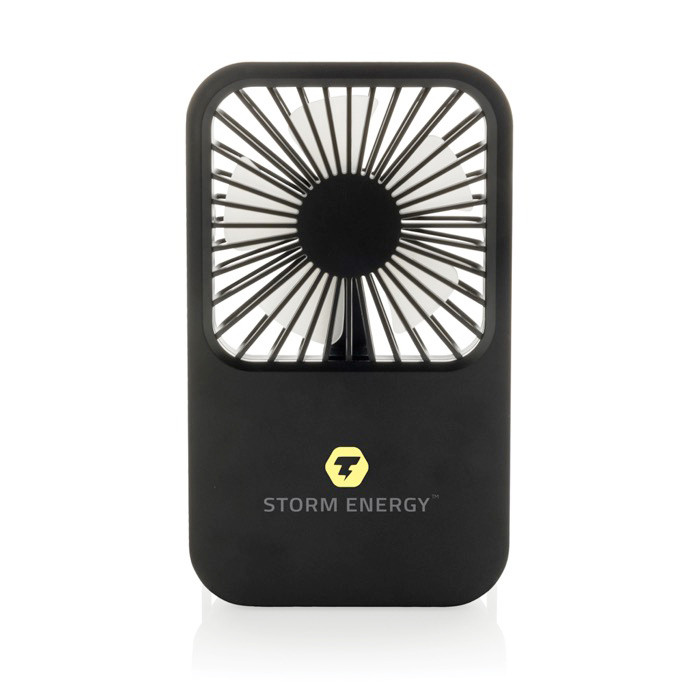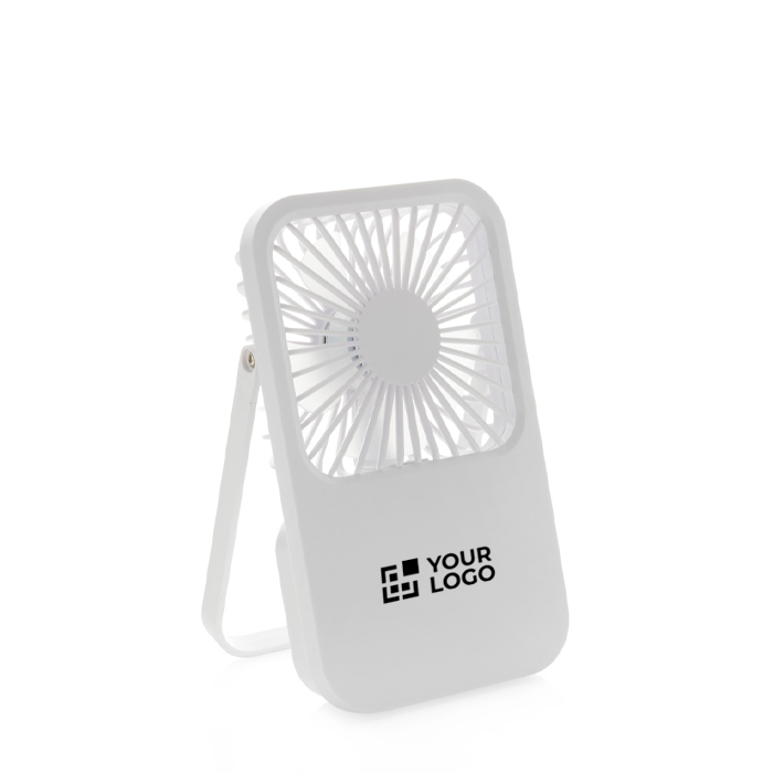 Ventilador de escritorio fabricado en plástico reciclado. pensado para dar aire fresco en puestos de trabajo. recepciones o salas de reuniones. Integra batería recargable de 1200mAh con hasta 3 horas de uso y carga aproximada en 4 horas mediante cable USB-A a USB-C incluido. Permite ajustar el caudal con tres niveles de velocidad y orientar el flujo gracias a su soporte regulable. Presentación en caja kraft con Certificación de Sostenibilidad Forestal (FSC). Una opción práctica para acciones de marca en oficina o eventos.