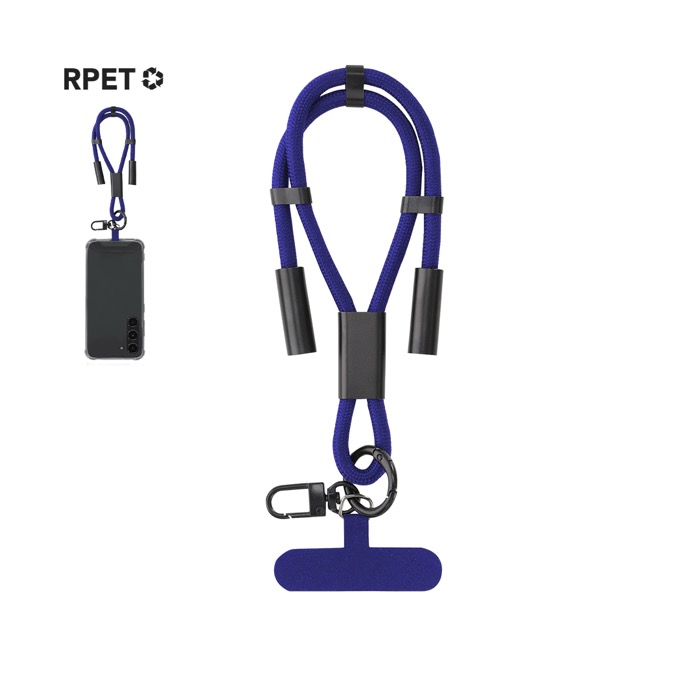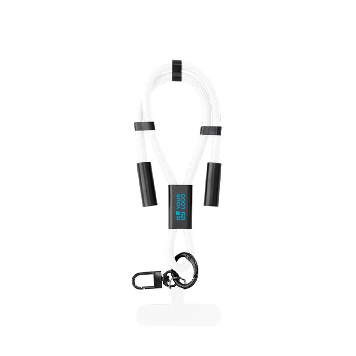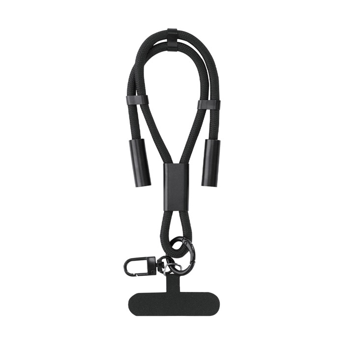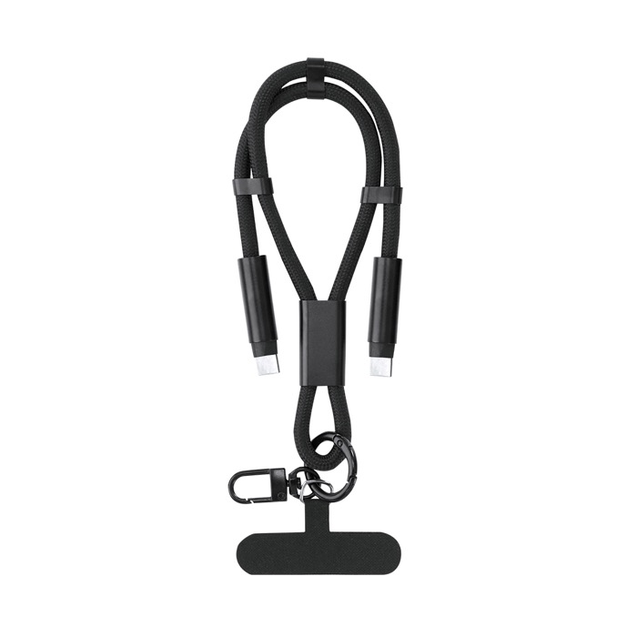 Pulsera de poliéster de plástico reciclado con función de soporte para smartphone y cable cargador integrado. Diseñada para colocarse entre la funda y el teléfono mediante su accesorio de transporte, ayuda a llevar el dispositivo más seguro en el día a día. Incluye cinta a juego, mosquetón metálico giratorio en color negro y ajustador para la muñeca. Permite carga y traspaso de datos con entrada USB-C hasta 60W y salidas USB-C. Recurso práctico para acciones de RRHH, ferias y eventos corporativos.