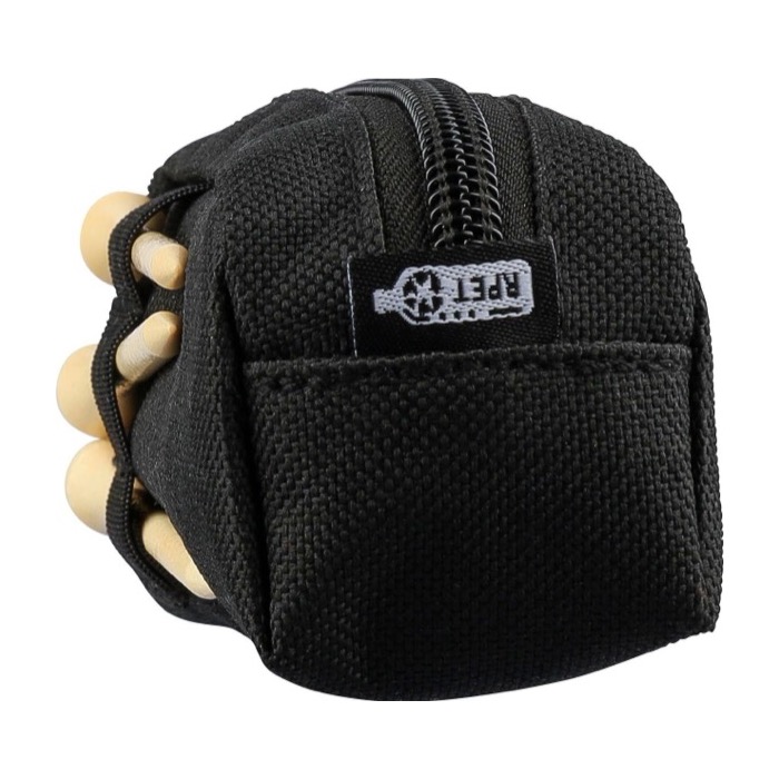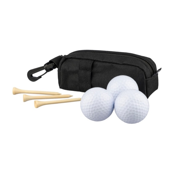 Set de golf con estuche de plástico reciclado y cierre de cremallera, pensado para llevarlo a mano o colgado gracias al mosquetón. Incluye 3 bolas de golf de entrenamiento y 3 tees de madera de haya, una combinación práctica para sesiones rápidas y para tener repuestos en el campo. El estuche incorpora fuelle, aportando un poco más de capacidad y mejor acceso al contenido. Puede entregarse como detalle en torneos corporativos o en acciones de marketing vinculadas a deporte.