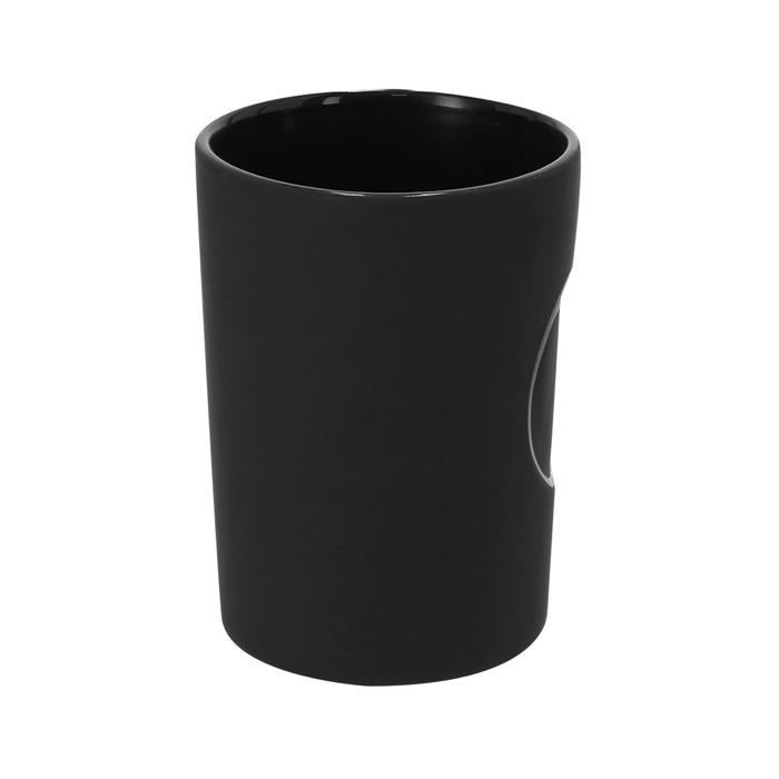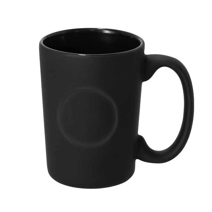 Taza de cerámica de 400 ml con relieve central y exterior mate. Tu logo en marcaje láser ganará presencia y permanencia en cada pausa de tu jornada.