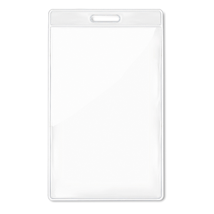 Identificador de plástico transparente de orientación vertical para poner las credenciales y colgar de un lanyard, ideal para dar en ferias y congresos.