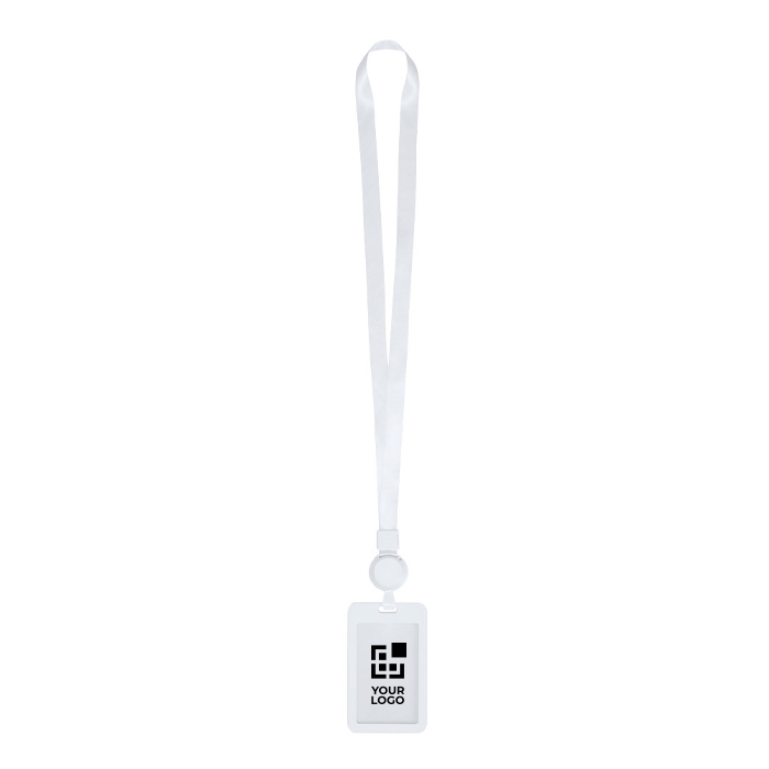 Lanyard de poliéster blanco con identificador extensible y portatarjetas de plástico desmontable. Incluye funda con parte trasera opaca y frontal translúcida para mantener el pase visible, además de enganche en clip para fijarlo con rapidez. La cuerda extensible alcanza hasta 70cm, facilitando el acceso a tornos, mostradores o lectores sin quitarte la acreditación. Solución práctica para control de accesos, atención al público y acreditaciones en ferias, congresos o entornos corporativos.