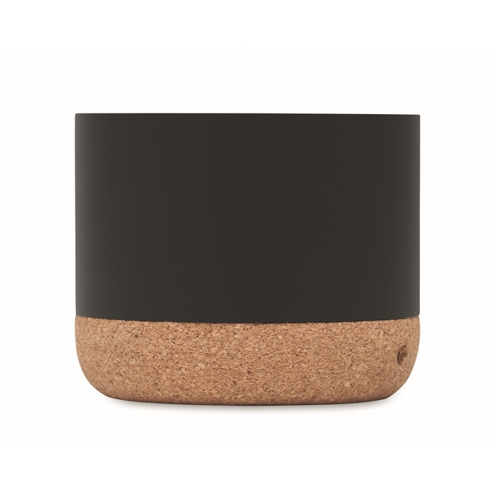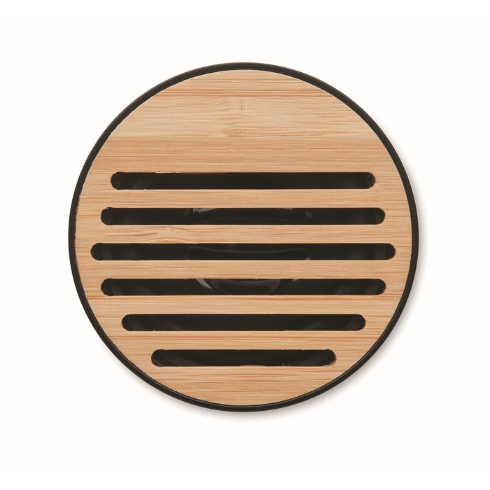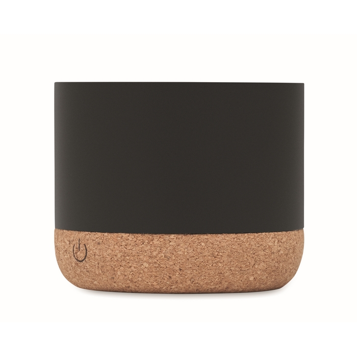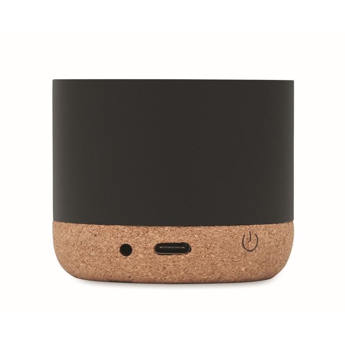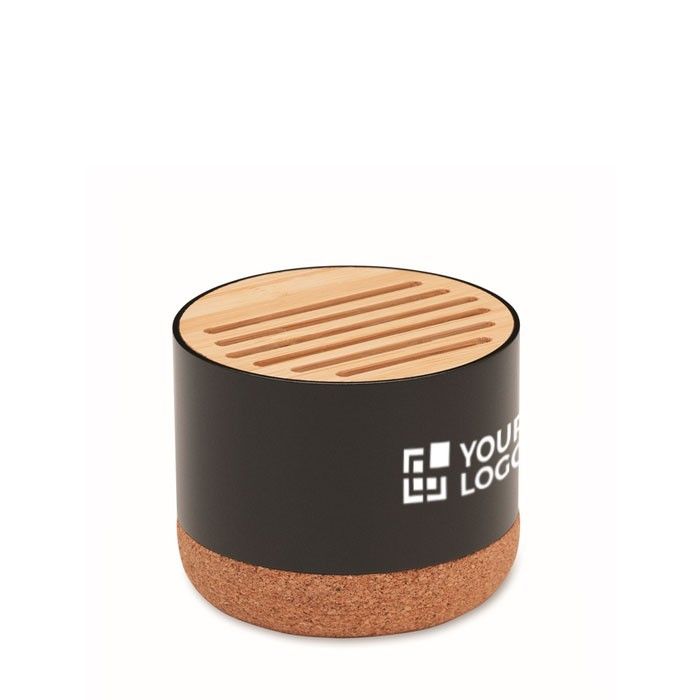 Altavoz circular inalámbrico con base de corcho y detalle en bambú