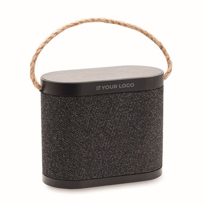 Altavoz inalámbrico 5.3 fabricado en ABS con un elegante acabado en tejido de poliéster RPET y una parte superior de bambú, complementado con un asa de yute para facilitar su transporte. Ofrece una potencia de 15 watts, ideal para reuniones o presentaciones. Su batería recargable de iones de litio de 1200 mAh permite una reproducción continua de aproximadamente 4 horas. Con datos de salida de 5W, 4 Ohm y 5V, garantiza un sonido claro y potente. El servicio Express asegura una entrega rápida. Perfecto para empresas que buscan integrar soluciones tecnológicas sostenibles en sus estrategias de branding.