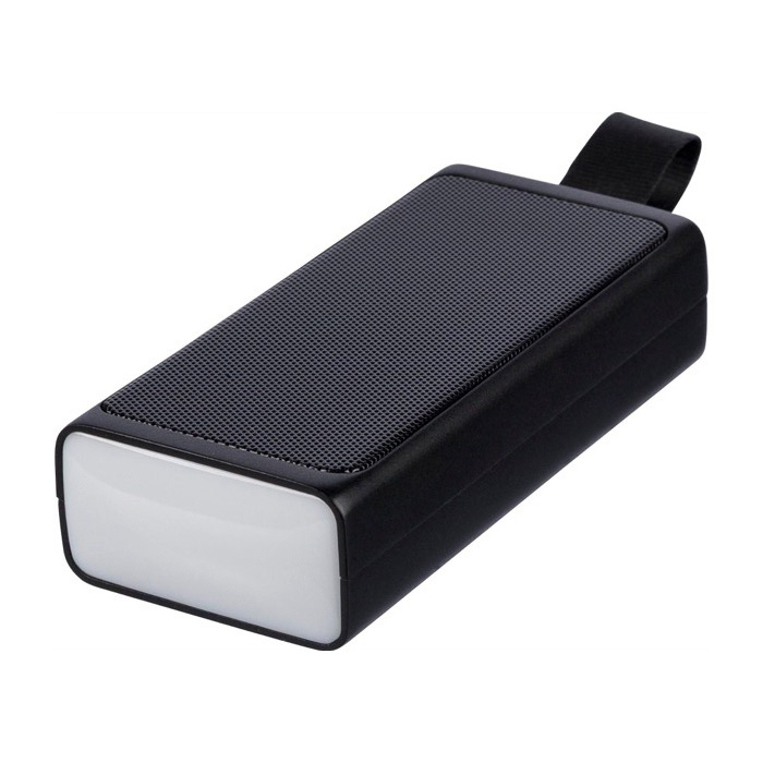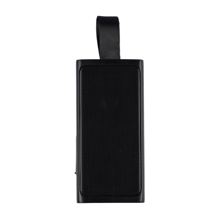 Altavoz portátil de plástico reciclado con malla metálica y linterna COB LED (chip on board) integrada para apoyo en exteriores. Incorpora asa de transporte de silicona para moverlo con comodidad y conexión inalámbrica 5.4 para emparejarlo con móviles y tablets. Integra batería de 500mAh y carga mediante entrada Micro B, con alimentación 5V/500mA. Incluye logotipo de reciclado y se entrega en caja individual de cartón marrón. Adecuado para acciones de marca en eventos, rutas o promociones de verano.