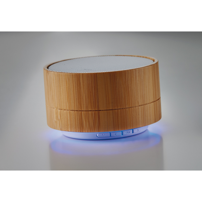 - Altavoz inalámbrico con carcasa de bambú y luz inferior
