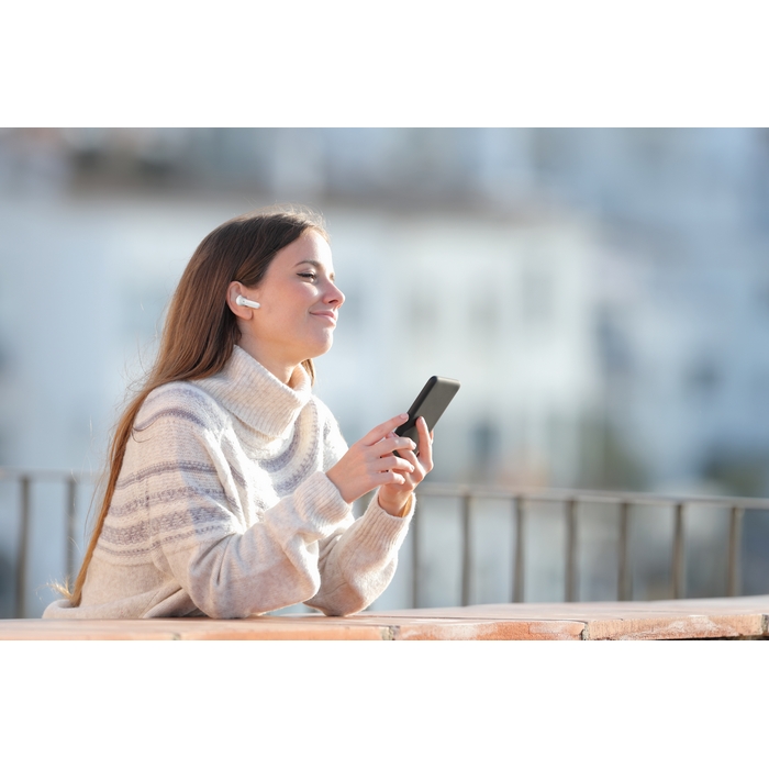 Auriculares estéreo inalámbricos True Wireless Stereo (TWS) 5.3 fabricados en ABS reciclado. Equipados con micrófono integrado y batería de 25 mAh por auricular, ofrecen una experiencia auditiva cómoda y sin cables. Incluyen base de carga de 250 mAh y cable tipo C. El tiempo de reproducción estimado es de 4 horas. Su diseño compacto y materiales reciclados refuerzan el compromiso con el medio ambiente sin renunciar a la tecnología actual. Un merchandising tech para estar a la última.