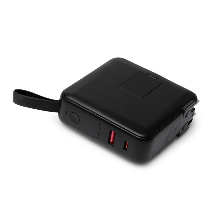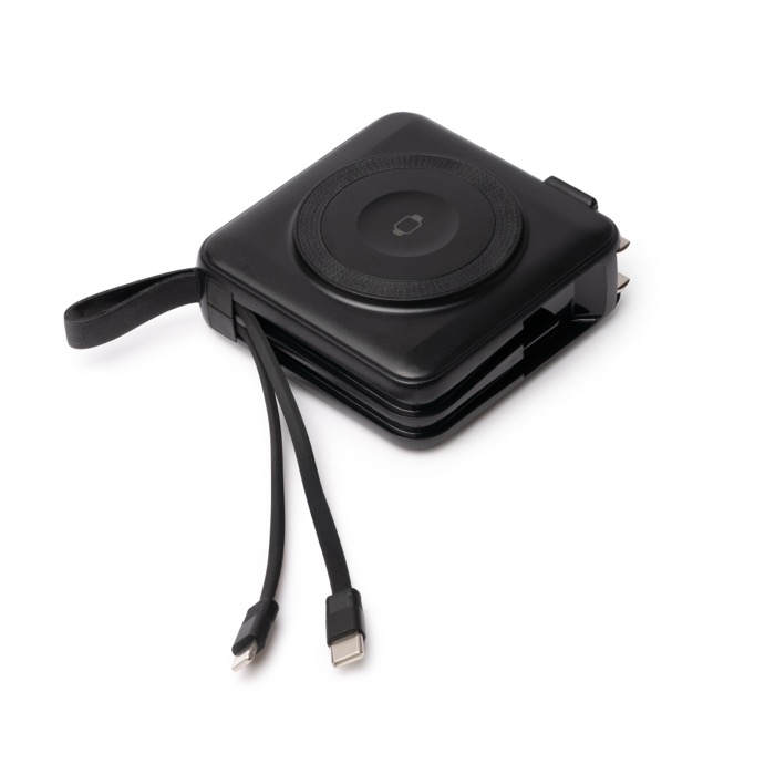 Batería externa de plástico con formato 3 en 1 y capacidad de 10.000mAh, pensada para cargar varios dispositivos a la vez. Ofrece carga rápida por cable hasta 20W y carga inalámbrica de 15W con base integrada para móviles compatibles. Incorpora cables Tipo C y Lightning integrados, además de puertos Tipo C y USB para mayor versatilidad. La pantalla muestra el porcentaje de batería en todo momento. Incluye adaptadores de corriente internacionales y puede usarse como cargador de pared. Útil para eventos, equipos comerciales o viajes de empresa.