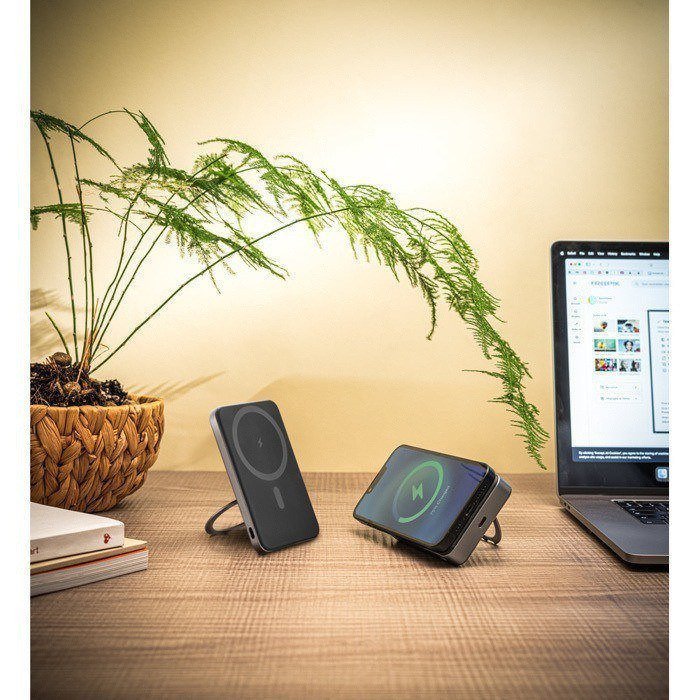 Este powerbank magnético de 5.000 mAh, fabricado con ABS reciclado, te permite ofrecer una solución de carga moderna y ecológica. Su diseño delgado incluye un anillo de soporte 360º, lo que facilita el uso cómodo de dispositivos. Con carga inalámbrica rápida de 15W y entradas y salidas USB-C PD 20W, garantiza una conectividad eficiente. El agarre magnético adicional asegura estabilidad, mientras que el cable USB-C con adaptador amplía su versatilidad. Se entrega en una caja kraft reciclado, reforzando el compromiso con la sostenibilidad. Al elegir este producto, tu marca se asocia con innovación y responsabilidad ambiental.