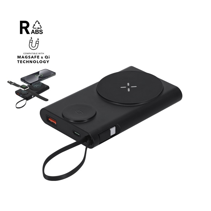 Batería auxiliar externa fabricada en plástico reciclado, pensada para recargar móviles y accesorios en desplazamientos. Integra carga inalámbrica de 15W compatible con tecnología Qi (estándar de carga inalámbrica) y fijación magnética Magsafe para mantener el teléfono estable mientras carga. Incorpora entrada y salida USB Tipo C, además de conexión USB-A, con indicadores LED de nivel de batería y botón de encendido/apagado. Incluye cable de carga Tipo C. Opción práctica para acciones de marca en eventos, equipos comerciales o bienvenida corporativa.