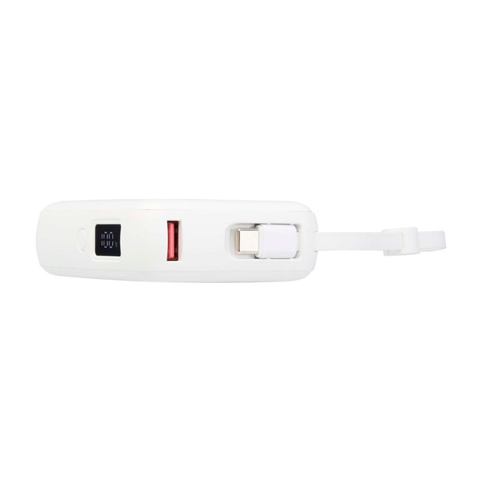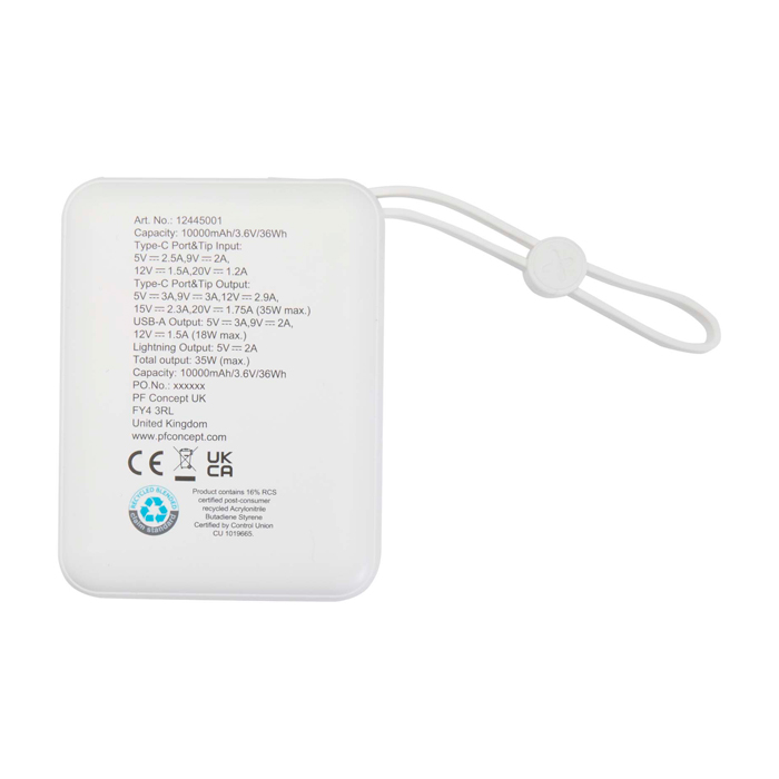 Batería externa de 10,000 mAh fabricada en plástico reciclado. Diseñada para ofrecer eficiencia y sostenibilidad, cuenta con un puerto de entrada/salida USB-C de 35 W y un puerto USB-A de 18 W, permitiendo una carga rápida y versátil. El cable integrado USB-C y Lightning elimina la necesidad de accesorios adicionales, simplificando el proceso de carga. Una pantalla digital proporciona información clara sobre el nivel de carga restante, asegurando que sus dispositivos estén siempre listos para usar. Suministrada en una caja de regalo individual con manual, es ideal para mantener smartphones y tabletas activos durante todo el día. Perfecta para empresas que buscan soluciones de carga eficientes y sostenibles para sus equipos móviles.