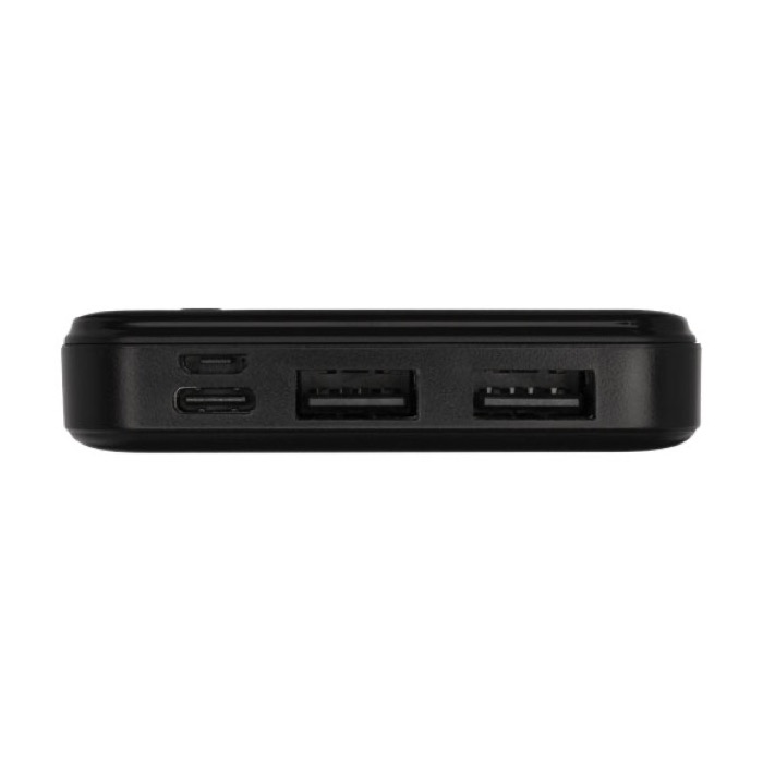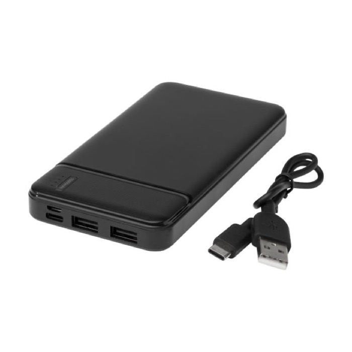 Batería externa fabricada con plástico ABS reciclado, con una capacidad de 10.000 mAh y tecnología de polímero de litio. Equipada con indicadores de potencia, permite una carga rápida y eficiente. Dispone de una entrada Type-C y Micro USB, además de una salida dual USB-A, ofreciendo versatilidad en las conexiones. Con una potencia total de 10W, se entrega con un cable de carga de TPE de 2A USB-A a Type-C de 30 cm. Ideal para empresas que necesitan mantener sus dispositivos cargados durante eventos o reuniones, o como parte de un kit de bienvenida para nuevos empleados.