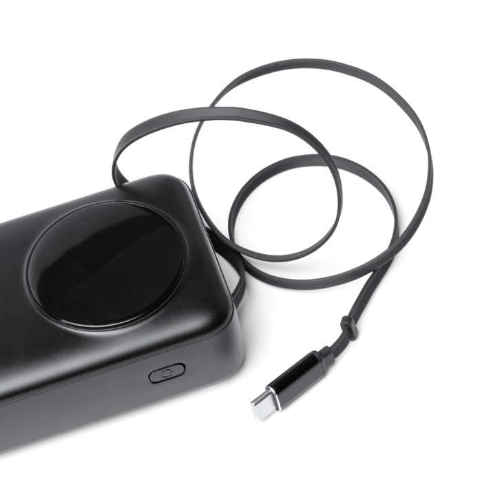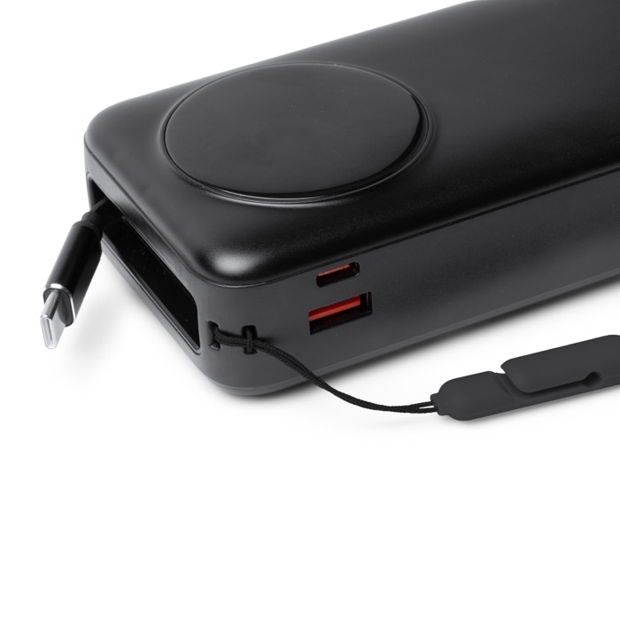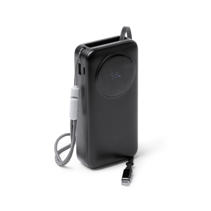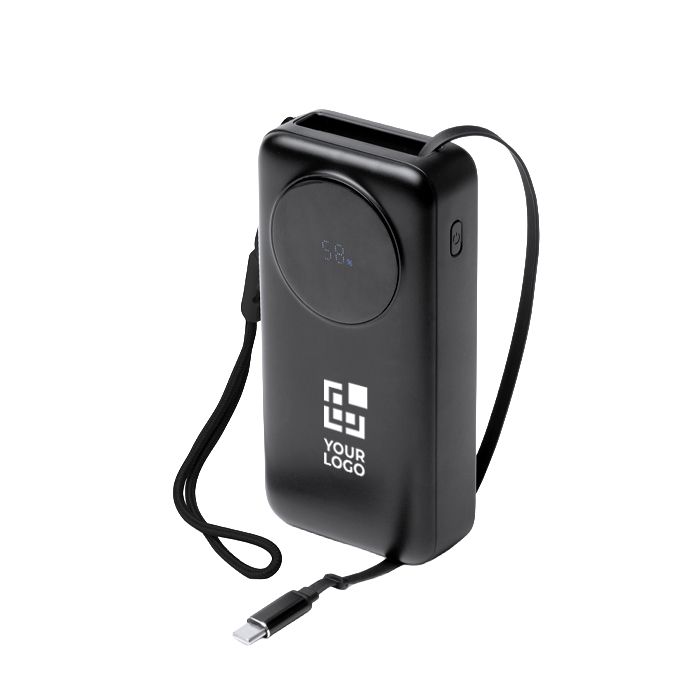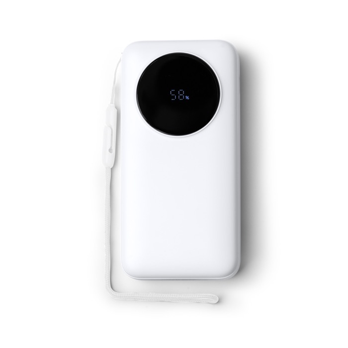 Power bank de plástico con gran capacidad de 20.000mAh y salida máxima de 22,5W para recargar móviles y accesorios con rapidez. Integra pantalla LED con el porcentaje de carga, lo que facilita controlar el nivel de batería durante el uso. Incluye cable Tipo C extensible a juego con el cuerpo, además de un puerto Tipo C de entrada y salida y un puerto USB de salida para mayor compatibilidad. Añade cinta de transporte de tela para llevarla cómoda en eventos, formaciones o desplazamientos de empresa.