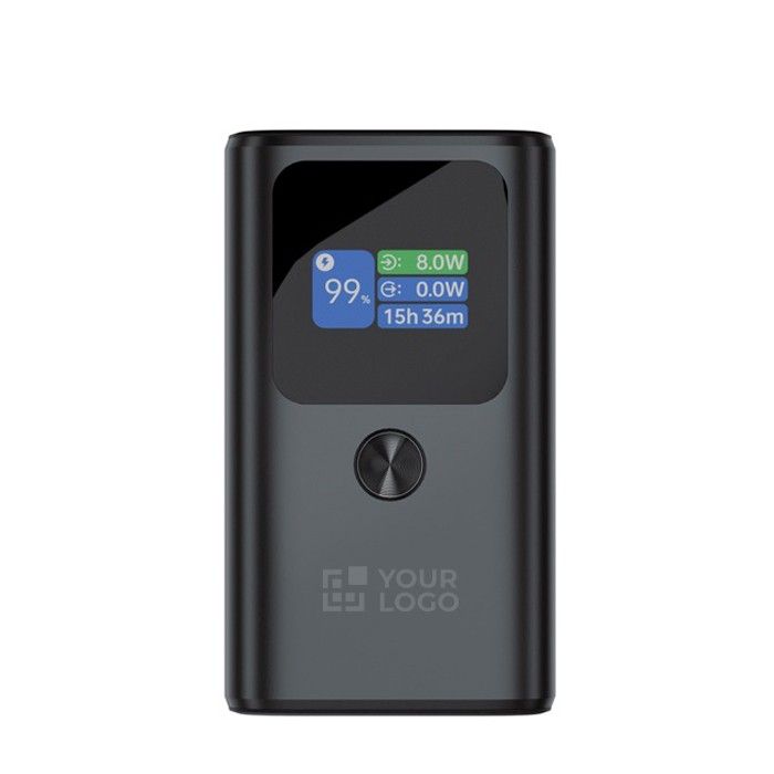 La batería externa de Urban Vitamin está fabricada en aluminio resistente, ofreciendo un diseño de bolsillo con una capacidad de 10.000 mAh. Su pantalla TFT a color proporciona información en tiempo real sobre la velocidad de carga y otros detalles esenciales, asegurando un control total. Con tres puertos de salida —dos USB-C y un USB-A—, alcanza una potencia de 55W, permitiendo cargar smartphones, tablets e incluso portátiles y MacBooks a máxima velocidad. Libre de PVC y presentada en un embalaje con contenido reducido de plástico, es una opción sostenible. Ideal para empresas que buscan soluciones de carga eficientes y portátiles, perfecta para eventos corporativos o como regalo de empresa.
