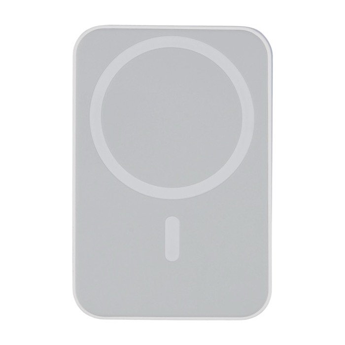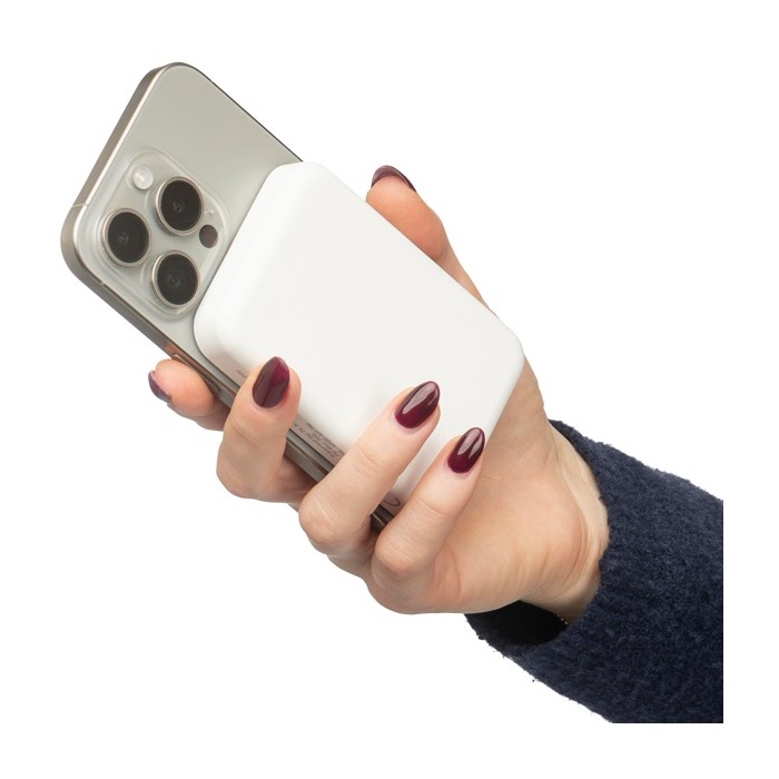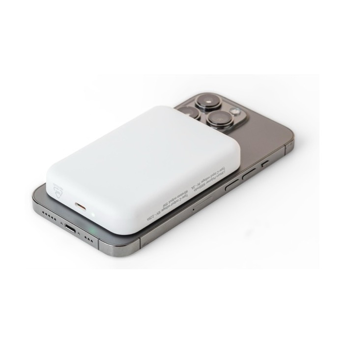 Powerbank de plástico reciclado con batería de ion litio de 5000mAh y carga magnética inalámbrica de 15W, compatible con MagSafe. Incorpora entrada USB-C (Universal Serial Bus tipo C) de hasta 20W y salida USB-C con varios perfiles de carga para adaptarse a distintos dispositivos. Integra protecciones frente a sobrecalentamiento, cortocircuito, sobretensión y sobrecarga, y detiene la carga automáticamente si sube la temperatura. Incluye anilla metálica adhesiva para equipos sin MagSafe. Opción práctica para acciones de marca en ferias, ventas y bienvenida corporativa.