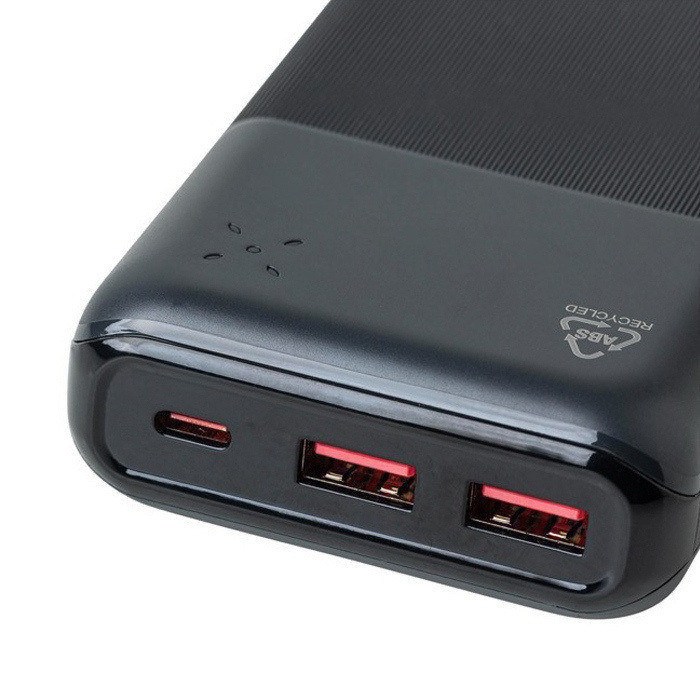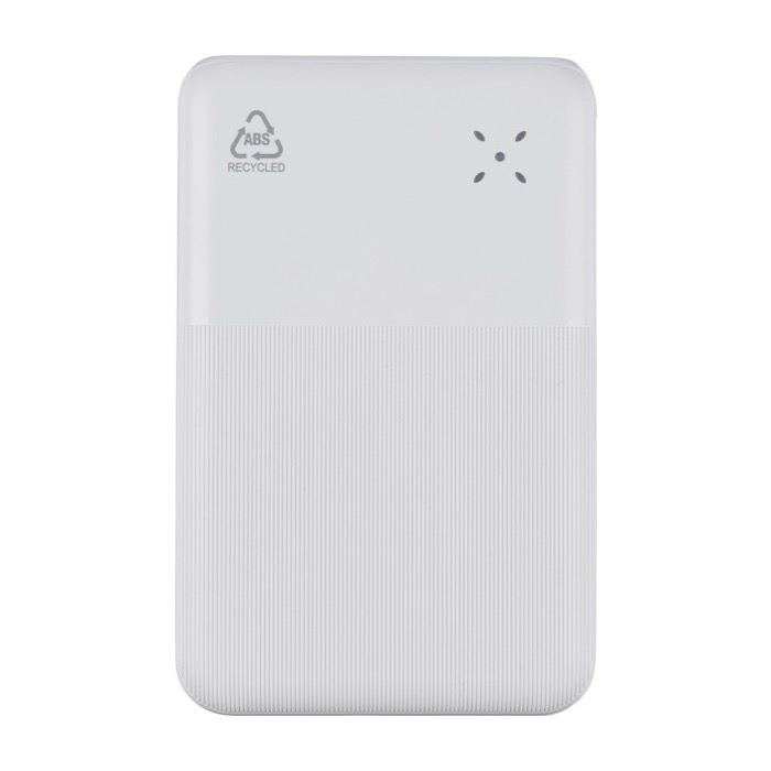 Powerbank de plástico reciclado con batería de ion litio de 20000mAh y carga rápida de 22,5W para el día a día en oficina, viajes o ferias. Incorpora entradas y salidas USB-C y USB-A para adaptarse a distintos cables y dispositivos. El indicador LED permite controlar el estado de la batería de un vistazo. Integra protecciones contra sobrecalentamiento, cortocircuito, sobretensión y sobrecarga para un uso más seguro. Se entrega en caja individual de cartón con papel de seda, listo para acciones de marca y eventos corporativos.