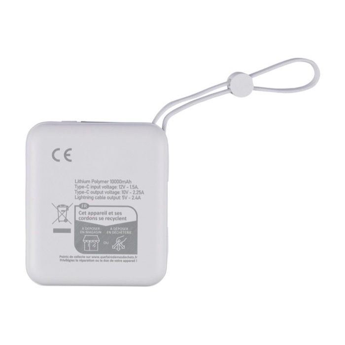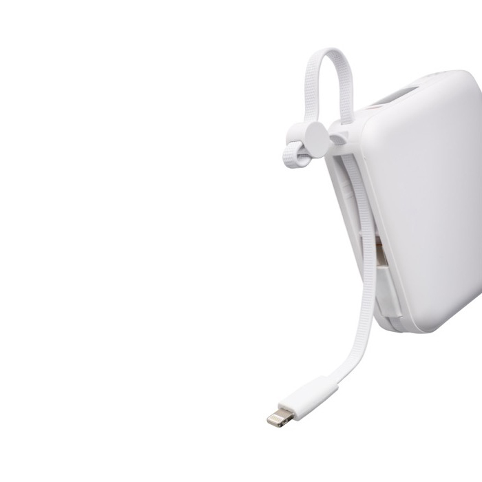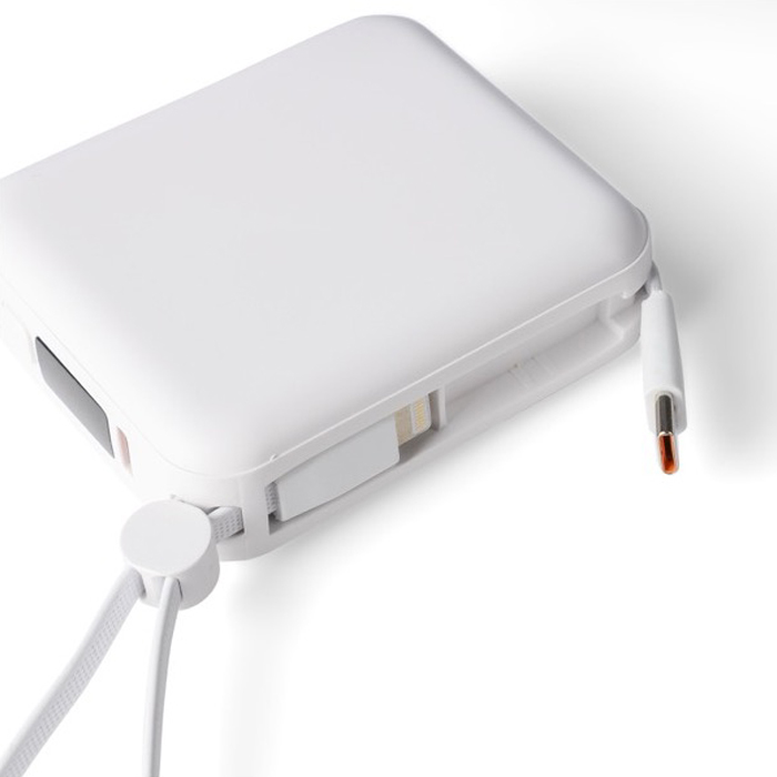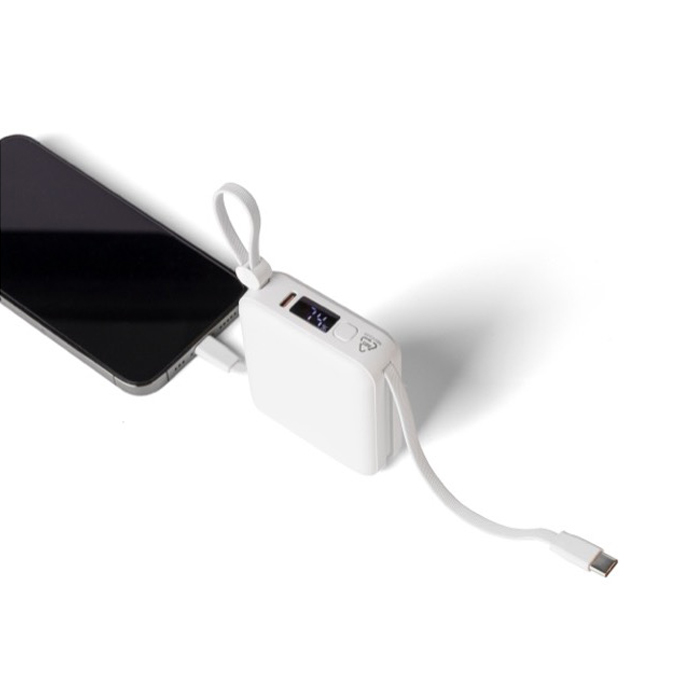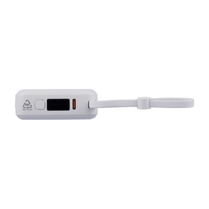 Powerbank de plástico reciclado con batería de ion litio y carga rápida de 22.5 W para mantener móviles y accesorios operativos durante la jornada. Incorpora cable TPE integrado para transporte que también funciona como cable de carga, con conectores Lightning y tipo C (USB-C). La pantalla LED digital superior muestra el nivel de batería de un vistazo. Incluye puertos de entrada/salida USB-C y entrada USB-A, además de protecciones frente a sobrecalentamiento, cortocircuito y sobrecarga.