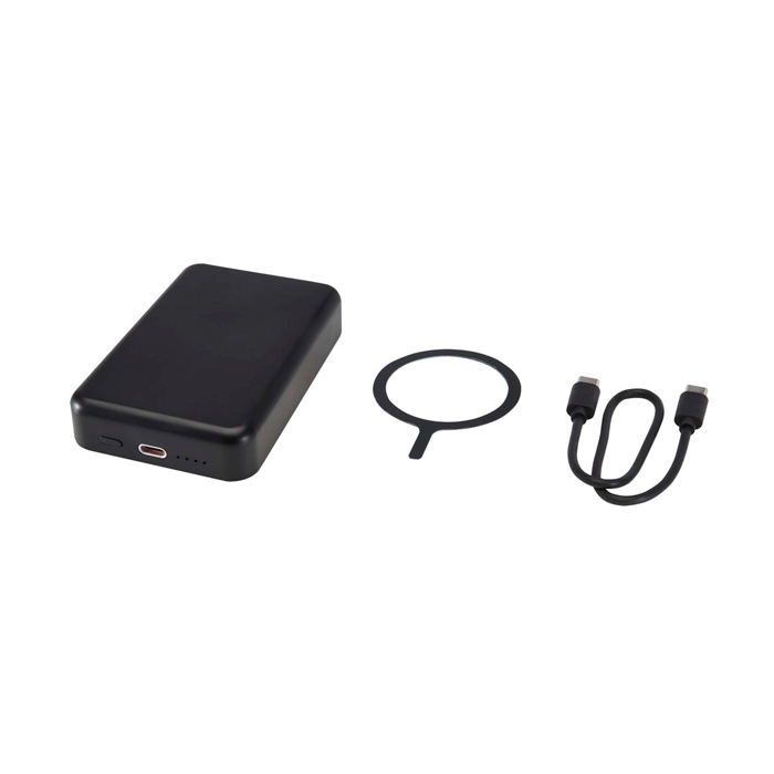 Batería externa compacta de 10.000 mAh, fabricada con plástico reciclado, ideal para mantener tus dispositivos siempre activos. Ofrece carga inalámbrica magnética de hasta 15 W, compatible con smartphones como el iPhone 12 y modelos posteriores. Incluye un adhesivo con anillo metálico para dispositivos sin imán, asegurando versatilidad. Además, admite carga rápida por cable USB-C de 20 W, permitiendo cargar dos dispositivos simultáneamente, uno de forma inalámbrica y otro por cable. Un indicador LED muestra el estado de carga y batería. Suministrada en una caja de regalo individual con manual, es perfecta para empresas que buscan soluciones de carga eficientes y sostenibles, ideal para eventos corporativos o como obsequio para clientes.