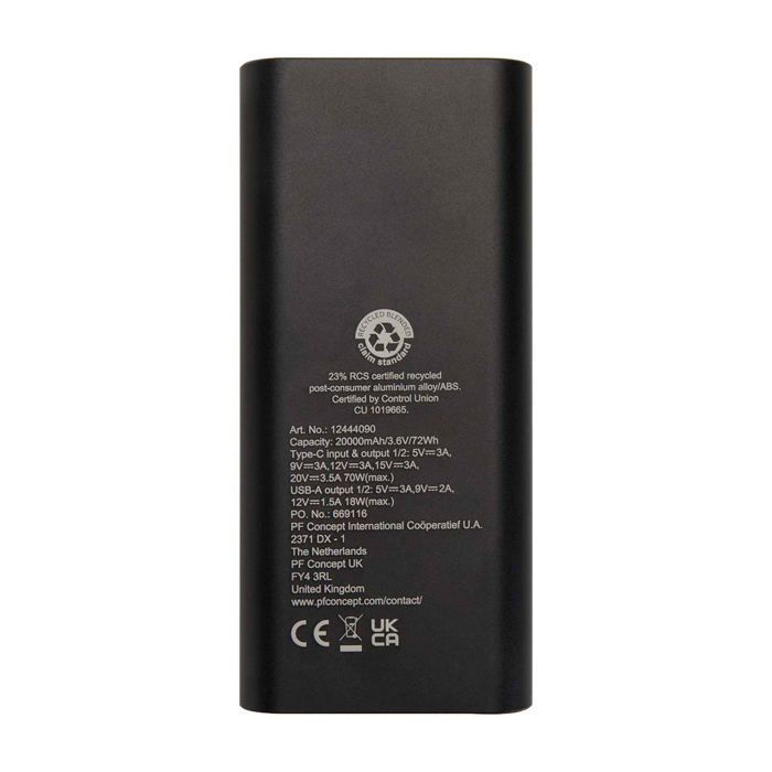Batería externa de 20,000 mAh fabricada en aluminio reciclado. Equipada con dos puertos USB-C de 70 W y dos USB-A de 18 W, es ideal para cargar portátiles, tabletas y smartphones de manera eficiente. La pantalla integrada permite monitorizar en tiempo real el porcentaje de carga y la potencia suministrada, facilitando el control del proceso de carga. Incluye un cable USB-C de 70 W para su uso o recarga directa. Se presenta en una caja de regalo individual con bolsa de plástico y manual. Perfecta para empresas que buscan soluciones de carga sostenibles y prácticas para sus equipos móviles.