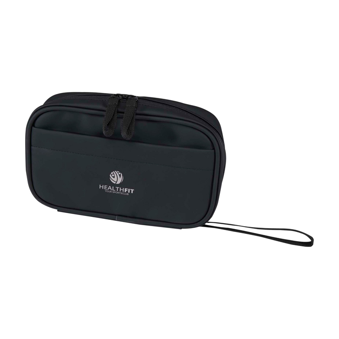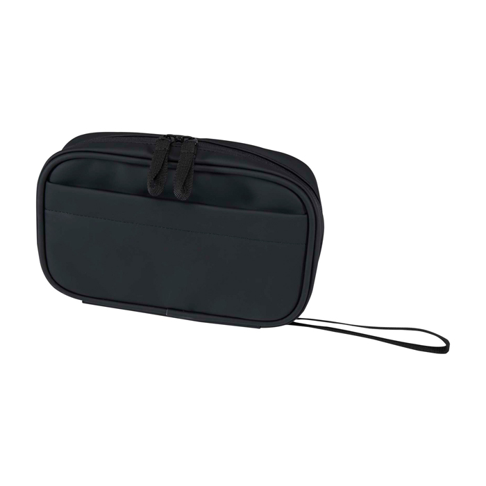 Bolsa organizadora tecnológica de piel sintética reciclada con forro de plástico reciclado a juego, pensada para mantener accesorios bien ordenados durante viajes o jornadas híbridas. El compartimento principal con cremallera incluye sujetabolígrafo elástico, dos bolsillos de malla para auriculares y pequeños objetos, separador reforzado y varias correas elásticas para cables, memorias USB y cargadores. En el exterior incorpora bolsillo frontal con velcro y asa de cincha. El revestimiento resistente al agua ayuda a proteger el contenido en desplazamientos y acciones de marca.