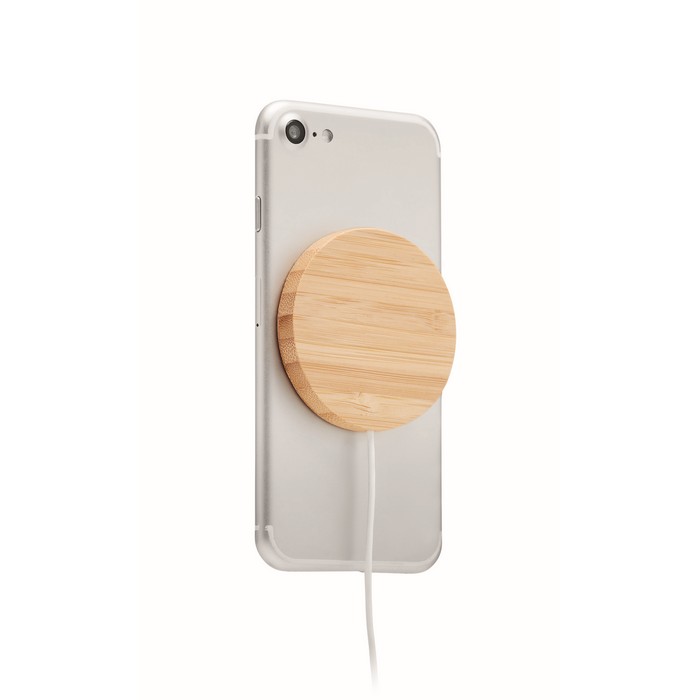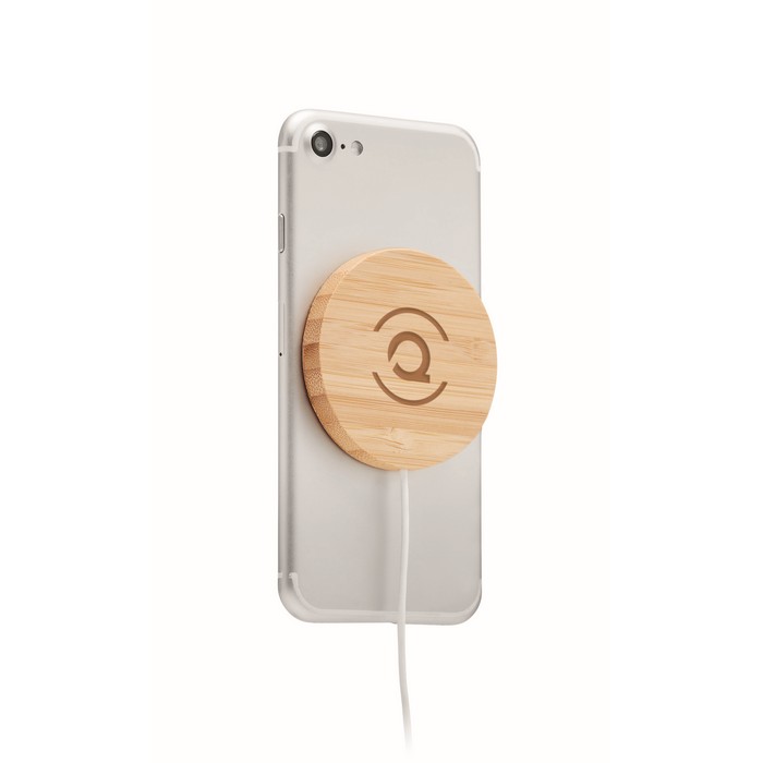 Ofrece a tu equipo un cargador inalámbrico de bambú magnético, que proporciona una experiencia de carga segura y elegante. Su carcasa de bambú, junto con un imán integrado, asegura un agarre firme del smartphone, evitando deslizamientos. Con una salida de DC 9V/1.1A (10W), garantiza una carga rápida, optimizando el tiempo de tus colaboradores. Compatible con el iPhone® 12 y posteriores, incluye un anillo metálico magnético adicional para otros teléfonos con carga inalámbrica no magnética. Este dispositivo es una adición práctica para cualquier escritorio, fusionando diseño natural y tecnología avanzada. Al proporcionarlo, tu marca comunica su compromiso con la innovación y el cuidado de los detalles.