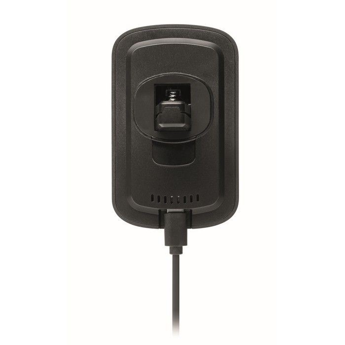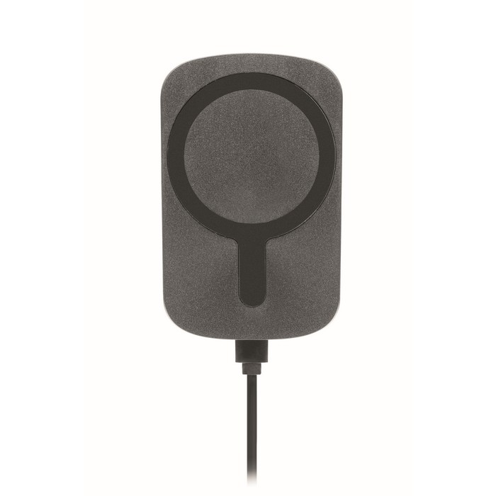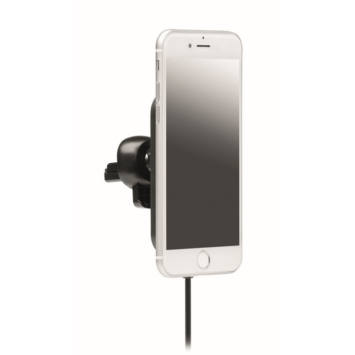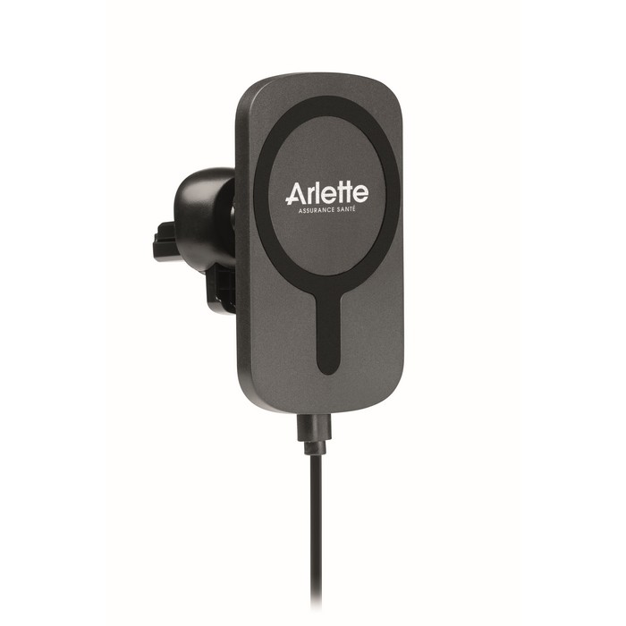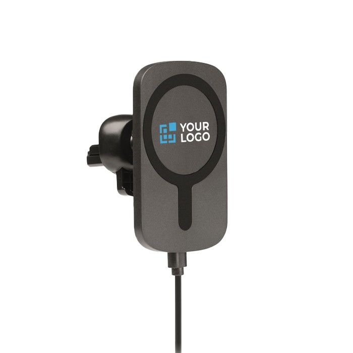 Cargador inalámbrico para coche fabricado con materiales de alta calidad, diseñado para integrarse perfectamente en la rejilla de ventilación del vehículo. Ofrece una potencia de carga de 10 W, permitiendo una carga rápida y eficiente. Simplemente conecta el dispositivo y coloca el smartphone sobre él; una luz azul indica que la carga está en proceso. Con una salida de DC 9V/1.1A, es compatible con los últimos modelos de Android y iPhone® 12 en adelante. Incluye un anillo metálico magnético adicional, ideal para teléfonos que no tienen carga inalámbrica magnética. Perfecto para empresas que buscan equipar sus flotas con tecnología moderna y eficiente.