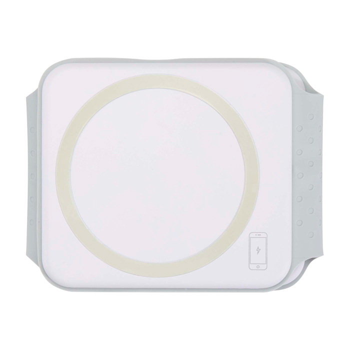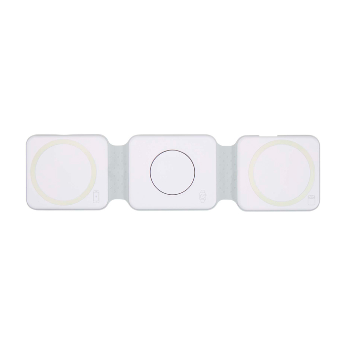 Cargador inalámbrico 3 en 1 de plástico reciclado pensado para cargar a la vez smartphone, auriculares tipo AirPods y reloj tipo iWatch. Ofrece carga inalámbrica de hasta 15W y un diseño plegable con cierre magnético que facilita transportarlo y mantener el teléfono estable durante el uso. Permite colocar el móvil en modo horizontal mientras carga, útil para videollamadas o visualización. Compatible con teléfonos con carga inalámbrica, incluido iPhone 12 y posteriores (o móviles con anillo magnético). Incluye conector tipo-C (USB-C). Buen recurso para acciones de marca en ferias o como detalle para equipos comerciales.