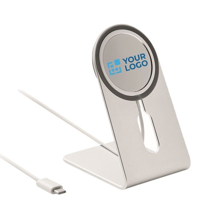 Cargador inalámbrico magnético de aluminio de 15W con soporte para teléfono. Diseñado para ofrecer una carga rápida y eficiente, este cargador cuenta con una salida de 9V/1.67A (15W), asegurando que los dispositivos estén listos en poco tiempo. Compatible con los últimos modelos de Android y iPhone® 12 y más recientes, se adapta a las necesidades tecnológicas actuales. Incluye un anillo metálico magnético adicional, permitiendo la carga de teléfonos con capacidades inalámbricas no magnéticas. Su diseño con soporte integrado facilita la visualización del contenido mientras se carga. Ideal para oficinas, salas de reuniones o eventos corporativos donde la conectividad y la eficiencia son clave.