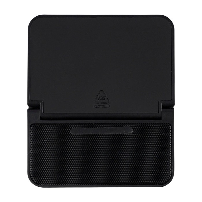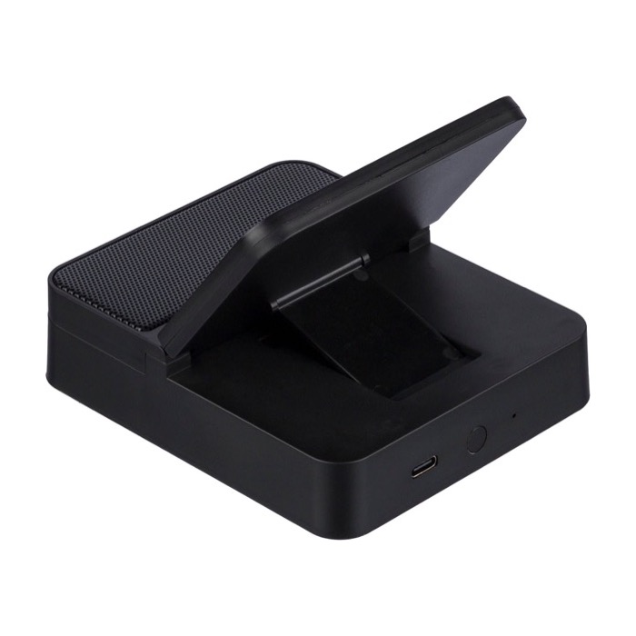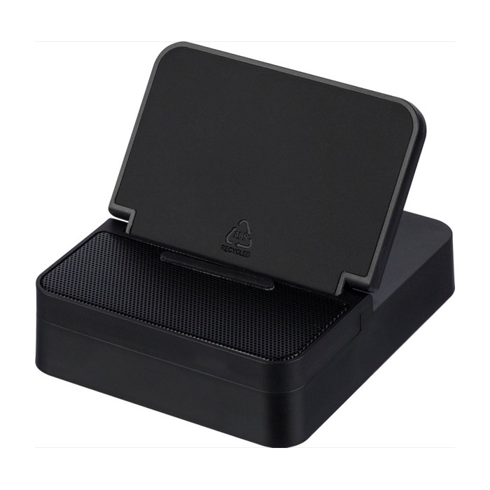 Estación de carga 3 en 1 de plástico reciclado con diseño en forma de cubo, pensada para escritorio y puntos de atención al cliente. Integra soporte para móvil, carga inalámbrica rápida de 15W y altavoz de 5W para reproducir audio en reuniones o espacios comunes. Incorpora conexión inalámbrica versión 5.4, batería de 1200mAh y entrada Micro B (micro-USB tipo B) de 5V/500mA. Acabado con frontal de malla metálica y detalle de piel sintética reciclada en la parte superior. Se entrega en caja de presentación, útil para acciones de marca y bienvenida corporativa.