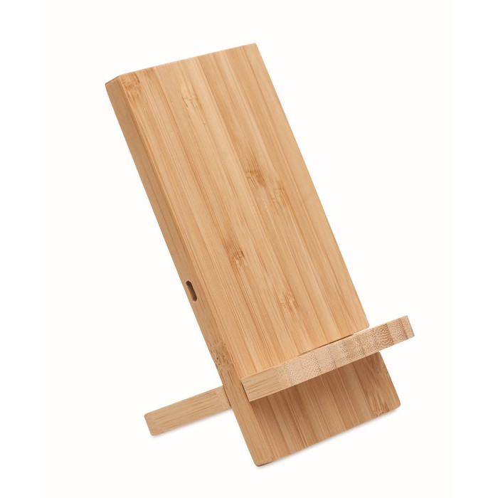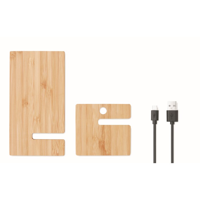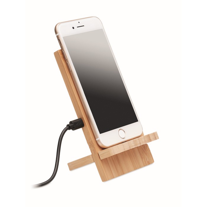 Un soporte de bambú con carga inalámbrica rápida te ofrece una solución eficiente y ecológica para tu smartphone. Con doble bobina, permite cargar tu dispositivo al colocarlo sobre él, asegurando una carga rápida con salida DC 9V/1.1A (10W). Su diseño facilita la visualización de contenido o videollamadas mientras se carga. Compatible con los últimos Android e iPhone® 8, X y más recientes, este soporte requiere montaje con sus 2 piezas. Personalizarlo asocia tu marca con innovación y sostenibilidad, mejorando la productividad de tus clientes o empleados.