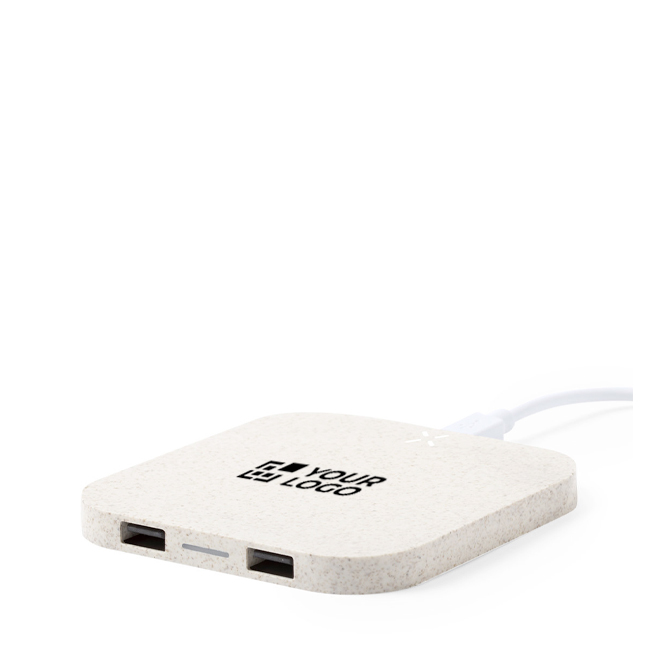 Cargador inalámbrico fabricado con carcasa de caña de trigo. Ofrece una salida USB dual con una capacidad de 2.100 mAh, permitiendo la carga simultánea de hasta tres dispositivos: uno de forma inalámbrica y dos mediante cable. La base antideslizante asegura estabilidad durante el uso. Con una potencia de 10 watts, este cargador es ideal para mantener tus dispositivos siempre listos sin complicaciones. Perfecto para oficinas o espacios de trabajo donde la eficiencia y la organización son clave, facilitando la carga de múltiples dispositivos de manera ordenada y efectiva.