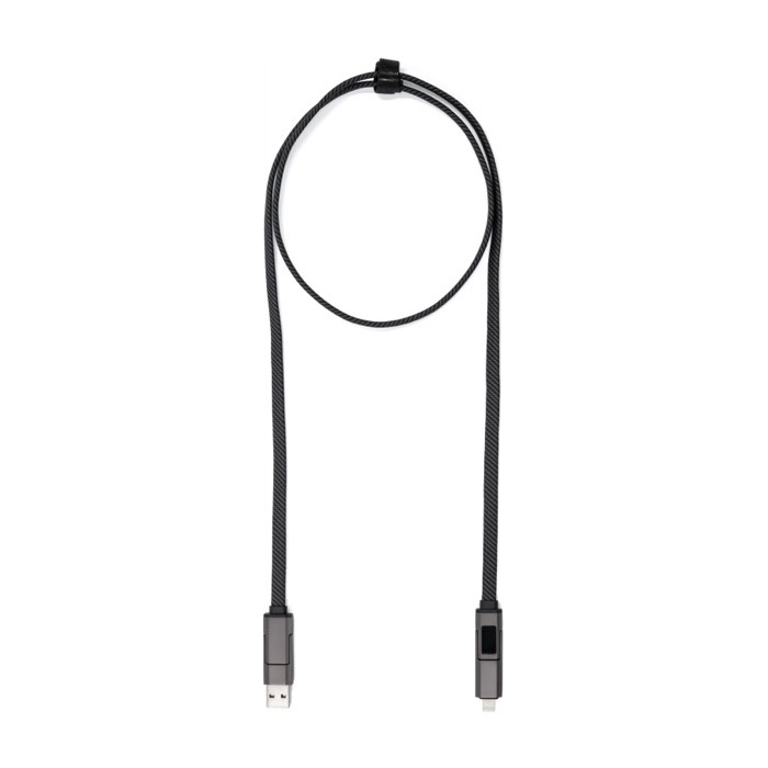 Cable de nylon reciclado de 120cm con diseño 4 en 1 para cubrir distintas necesidades de carga y conexión en el día a día. Incorpora entradas USB-C y USB-A, y ofrece salidas USB-C y Lightning para dar servicio a varios dispositivos con un sólo cable. Soporta carga rápida de hasta 65W en USB-C a USB-C y permite también transferencia de datos USB 2.0. Se entrega sin embalaje individual, pensado para uso intensivo en oficina, eventos o como soporte de marca en acciones corporativas.