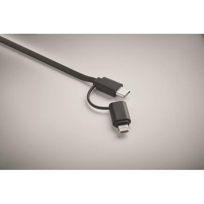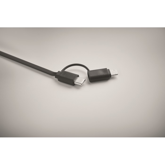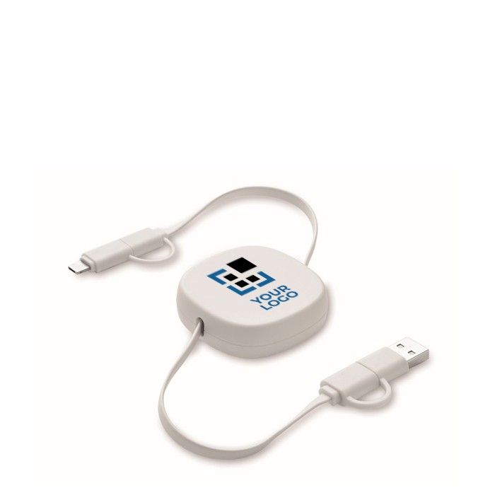 Un cable de carga con cables retráctiles de 80 cm te ofrece eficiencia y portabilidad para tus necesidades diarias. Su diseño compacto y la capacidad de 60 W lo hacen un gadget indispensable para cargar tus dispositivos rápidamente en cualquier lugar. Con una entrada 2 en 1 Tipo-C y Tipo-A, y salida Tipo-C y micro-B, se adapta a múltiples dispositivos. Fabricado con carcasa de ABS reciclado, demuestra el compromiso de tu empresa con la sostenibilidad. Este accesorio práctico y discreto se convierte en un compañero constante para tus empleados o clientes, integrando tu marca en su rutina tecnológica de forma consciente.