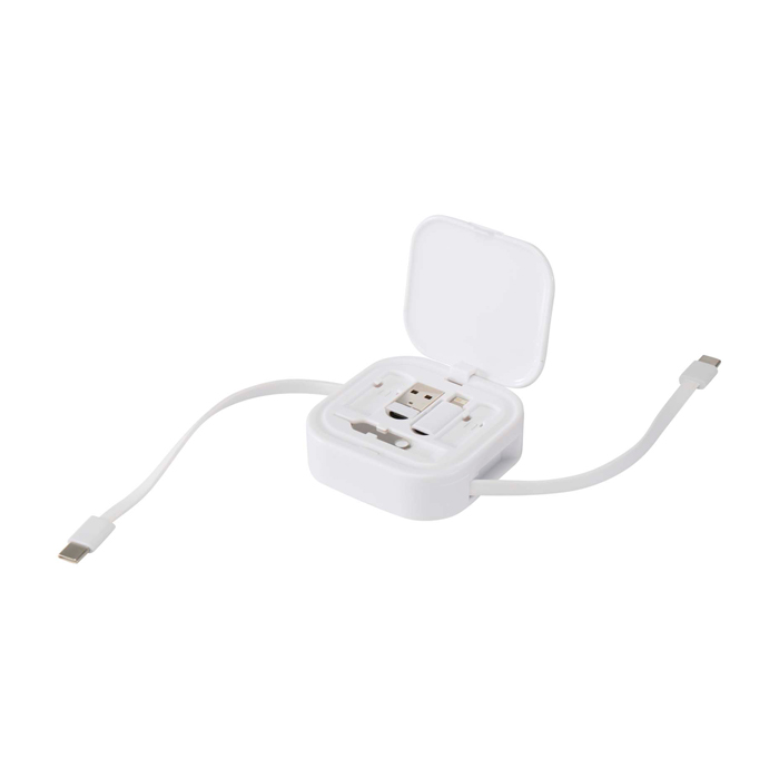 Herramienta y cargador fabricada con plástico reciclado, diseñada para ofrecer soluciones tecnológicas eficientes y sostenibles. Equipado con un cable retráctil USB-C, permite carga rápida y transferencia de datos de hasta 100 W, ideal para portátiles, tabletas y smartphones. Incluye adaptadores USB-A y un adaptador 2-en-1 micro-USB/Lightning, asegurando compatibilidad con CarPlay y Android Auto. Además, cuenta con un pasador de expulsión de SIM, espacio para una tarjeta SIM y una microSD, y un soporte para teléfono integrado, perfecto para videollamadas o visualización. Su diseño compacto facilita el transporte y almacenamiento. Ideal para empresas que buscan optimizar sus recursos tecnológicos y mejorar la conectividad en sus operaciones diarias.