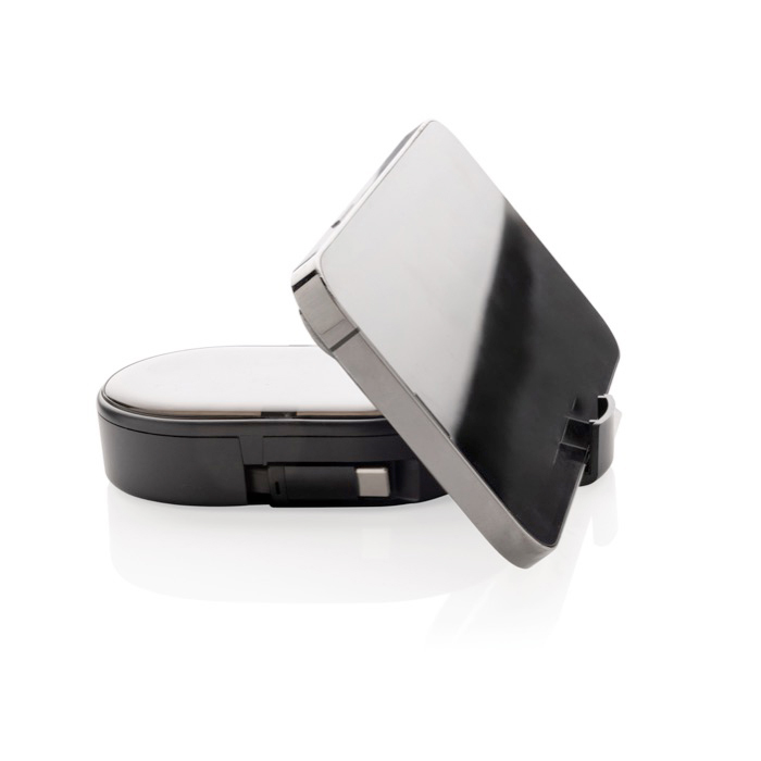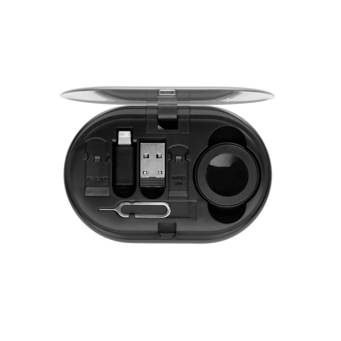 Juego de cables de carga retráctiles en materiales reciclados con certificación RCS (Recycled Claim Standard). pensado para llevarlo todo ordenado en un formato compacto. Integra un cable retráctil de 80cm con conectores USB-C. USB-A. Micro y Lightning para carga y transferencia de datos. Compatible con CarPlay y Android Auto. facilita la conexión en movilidad. Ofrece hasta 60W en USB-C a USB-C y 12W en otras combinaciones. Añade soporte para teléfono. pin de extracción SIM y ranuras para tarjetas. Recurso práctico para ferias. equipos comerciales o merchandising tecnológico.