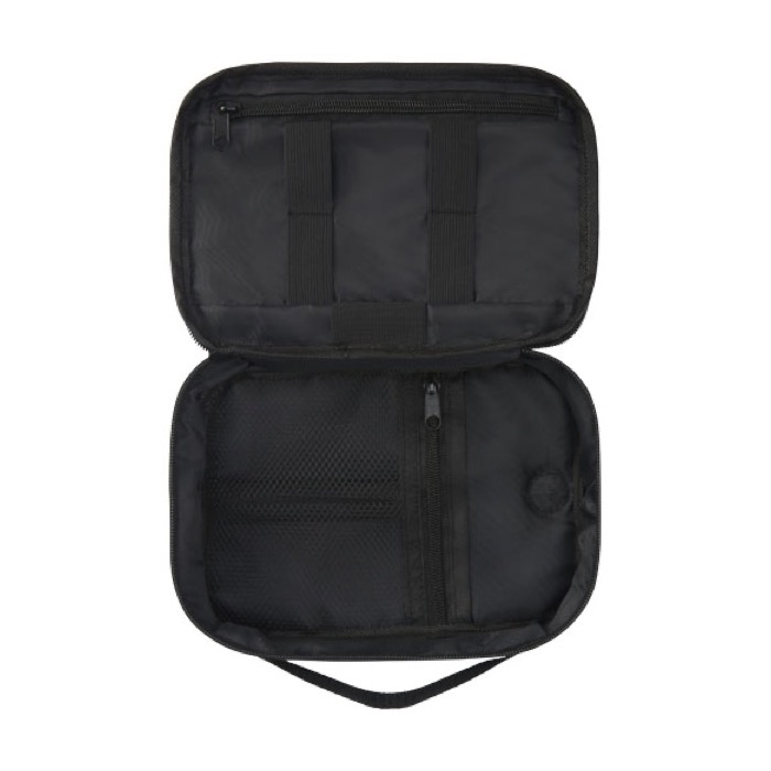 Funda organizadora fabricada con materiales reciclados (RPET), ideal para empresas que buscan soluciones sostenibles. Diseñada para organizar y transportar dispositivos electrónicos, cuenta con bolsillos y asas elásticas que facilitan el acceso a cables y cargadores. Su compartimento específico para cables asegura un almacenamiento ordenado, mientras que el mosquetón permite engancharla fácilmente a otras bolsas, ofreciendo versatilidad en el transporte. Con una capacidad de 1 litro, es compacta y práctica para el día a día. Sin embalaje individual, se entrega con servicio Express. Perfecta para empresas que desean ofrecer a sus empleados una solución eficiente para el manejo de gadgets y accesorios tecnológicos.