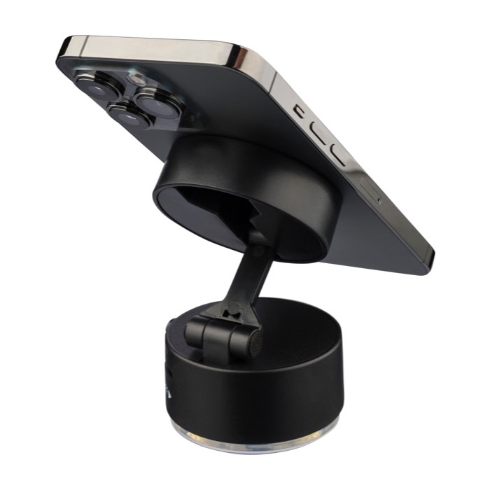 Soporte para móvil de plástico con sistema magnético compatible con MagSafe y ventosa con bloqueo para una fijación estable en superficies lisas. El diseño plegable reduce el volumen cuando no se usa y facilita guardarlo en la guantera o en el escritorio. Incluye anilla metálica para ampliar la compatibilidad a distintos modelos de teléfono, incluso si no cuentan con imán integrado. Se entrega en caja de presentación individual. Opción práctica para acciones de marca en flotas, eventos o regalos a equipos comerciales.