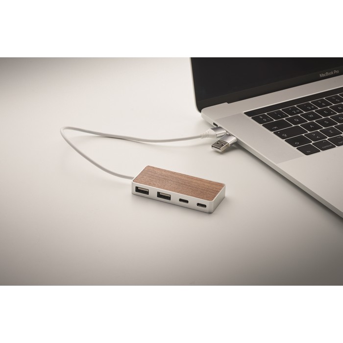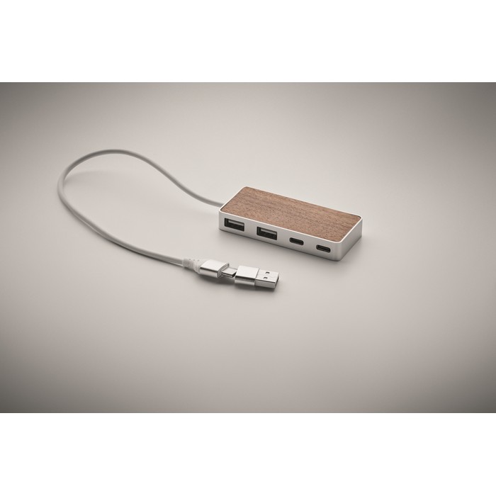 Hub de 4 puertos hecho de aluminio reciclado con detalle en nogal