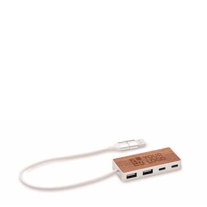 Hub USB 2.0 con puerto tipo C de bambú y cable con el logotipo