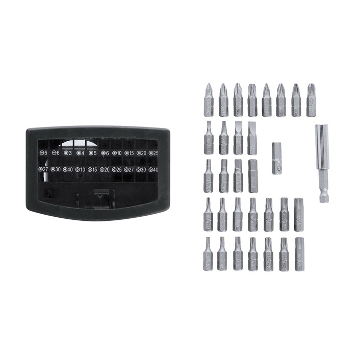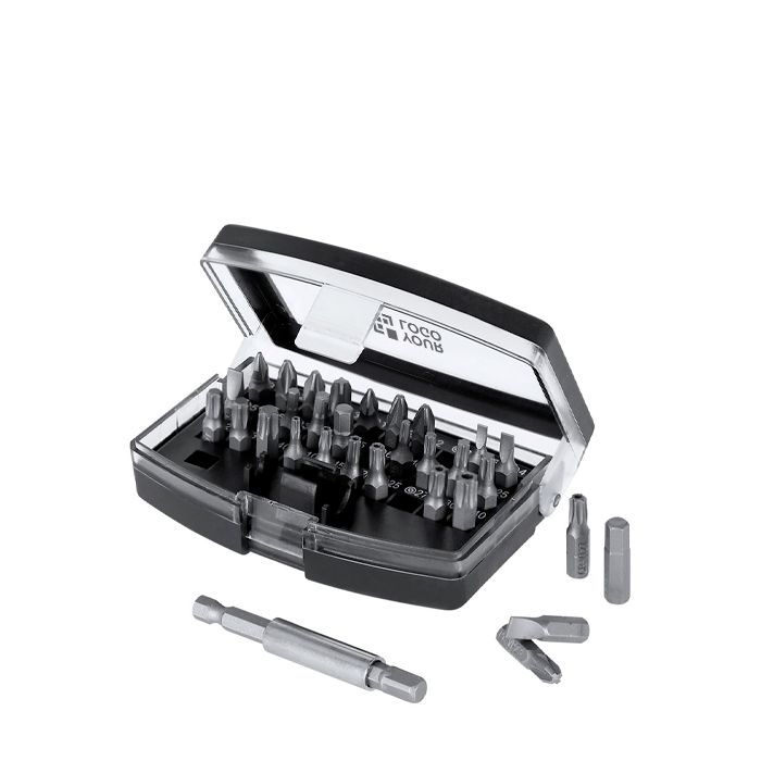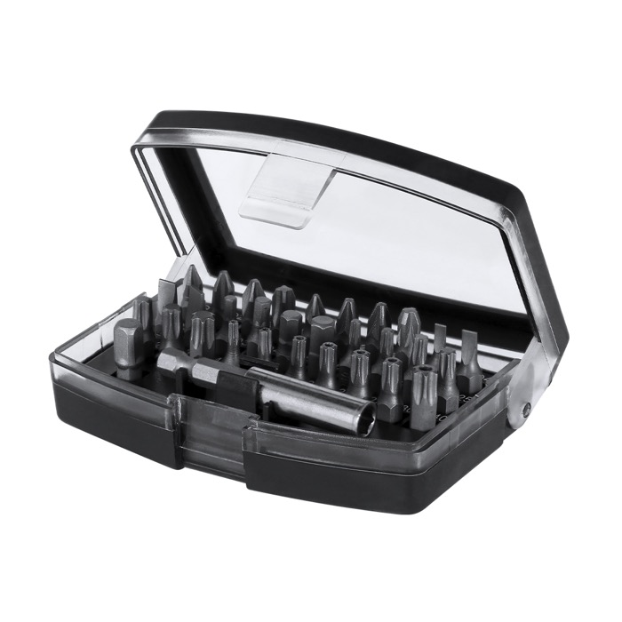 Set de herramientas con estuche de plástico, pensado para trabajos de precisión en oficina, mantenimiento y soporte técnico. Incluye un adaptador y 32 accesorios magnéticos con puntas variadas: philips, estrella, planas, hexagonales y torx, para cubrir la mayoría de tornillería habitual en dispositivos y pequeños equipos. El formato compacto ayuda a tenerlo ordenado y listo en el cajón o en una mochila. Buena opción para acciones de RRHH, ferias o merchandising corporativo con tu logo.