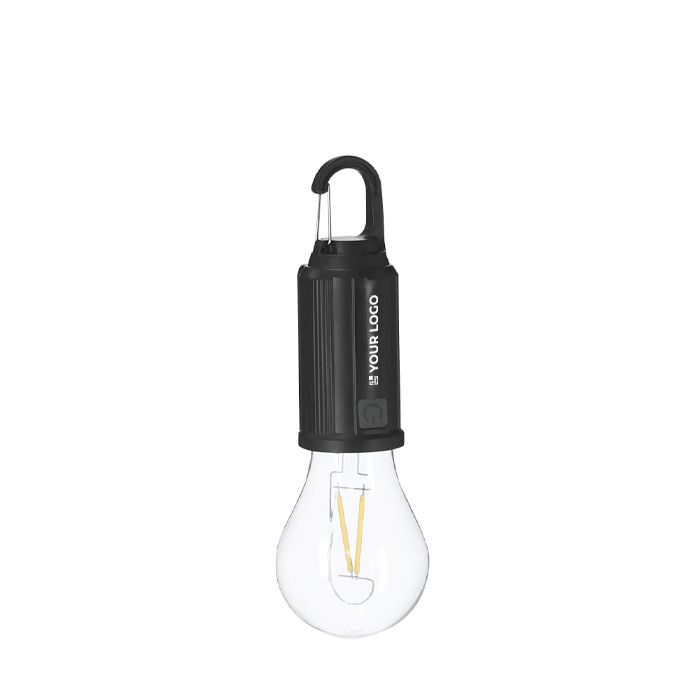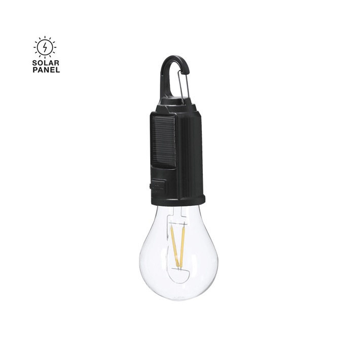 Lámpara con diseño de bombilla y cuerpo de plástico, pensada para usos puntuales en exterior o como punto de luz auxiliar. Integra batería de 300mAh y carga solar para recargarla durante el día, y añade sensor nocturno para activarse automáticamente cuando deja de recibir luz. También permite carga por cable Tipo C (USB-C) cuando se necesita una recarga rápida. Incluye mosquetón para colgarla en mochilas, carpas o puestos. Opción práctica para acciones de marca en eventos y campañas de verano.