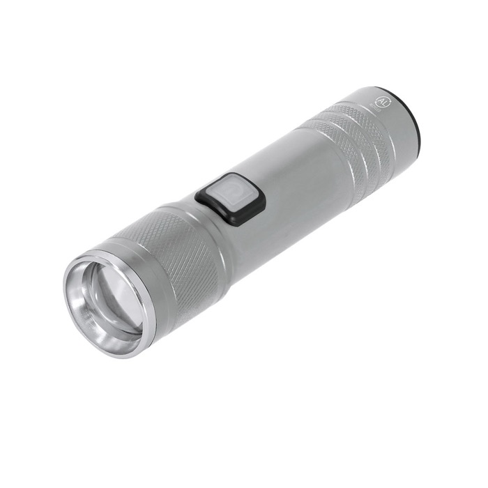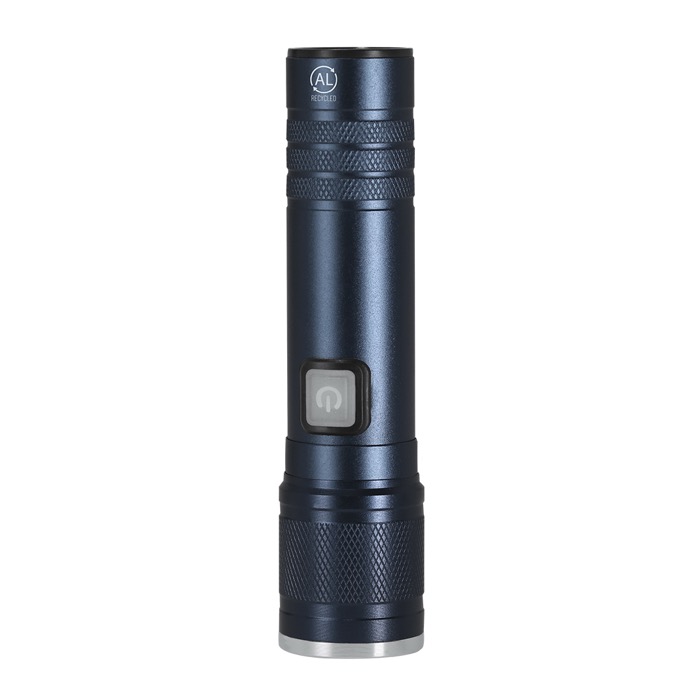Linterna de aluminio reciclado con acabado mate y zoom extensible para ajustar el haz según la situación. Integra 1 luz COB (chip on board) con tres posiciones para adaptar la iluminación en almacén, eventos o trabajo de campo. Incorpora botón on/off lateral y detalles decorativos cromados. Se recarga por USB-C e incluye cable de carga de 5V, evitando pilas y simplificando la logística en empresa. Opción práctica para acciones de marca, bienvenida a empleados o material de apoyo en ferias.