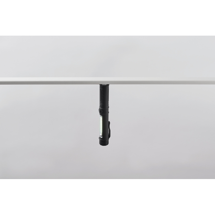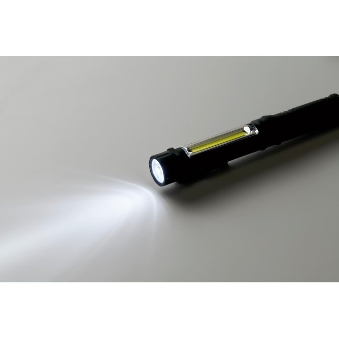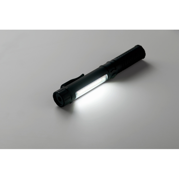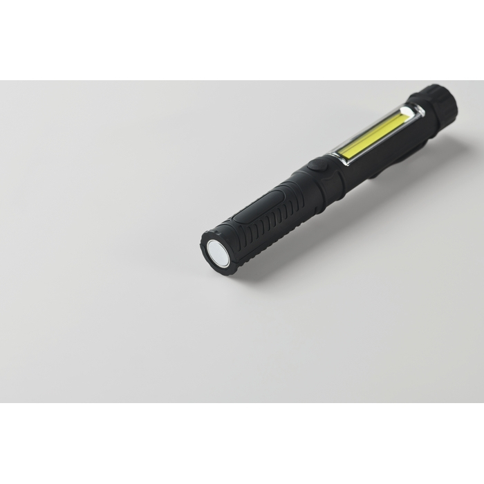 Linterna LED de trabajo en ABS con clip y luz COB lateral para una iluminación amplia. Incorpora base magnética para fijarla a superficies metálicas y trabajar con las manos libres, útil en montajes, almacén o mantenimiento. El formato compacto facilita llevarla en bolsillo o cinturón y orientarla según la tarea. Funciona con 3 pilas AAA (no incluidas), lo que simplifica la reposición. Opción práctica para equipos técnicos, ferias o kits corporativos.